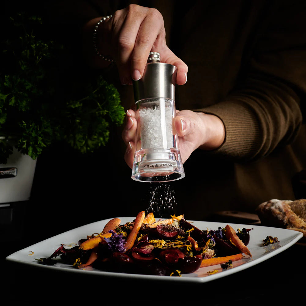 The Bromley Acrylic Salt & Pepper Mills feature a stylish combination of clear acrylic and stainless steel, offering a contemporary look with high functionality. The transparent acrylic body allows for easy visibility of contents, while the stainless steel accents provide a sleek and modern touch. These mills feature a durable grinding mechanism that offers smooth, adjustable seasoning, allowing users to switch between fine and coarse grinds effortlessly. A perfect blend of style and practicality, they are ideal for both casual dining and elegant table settings.