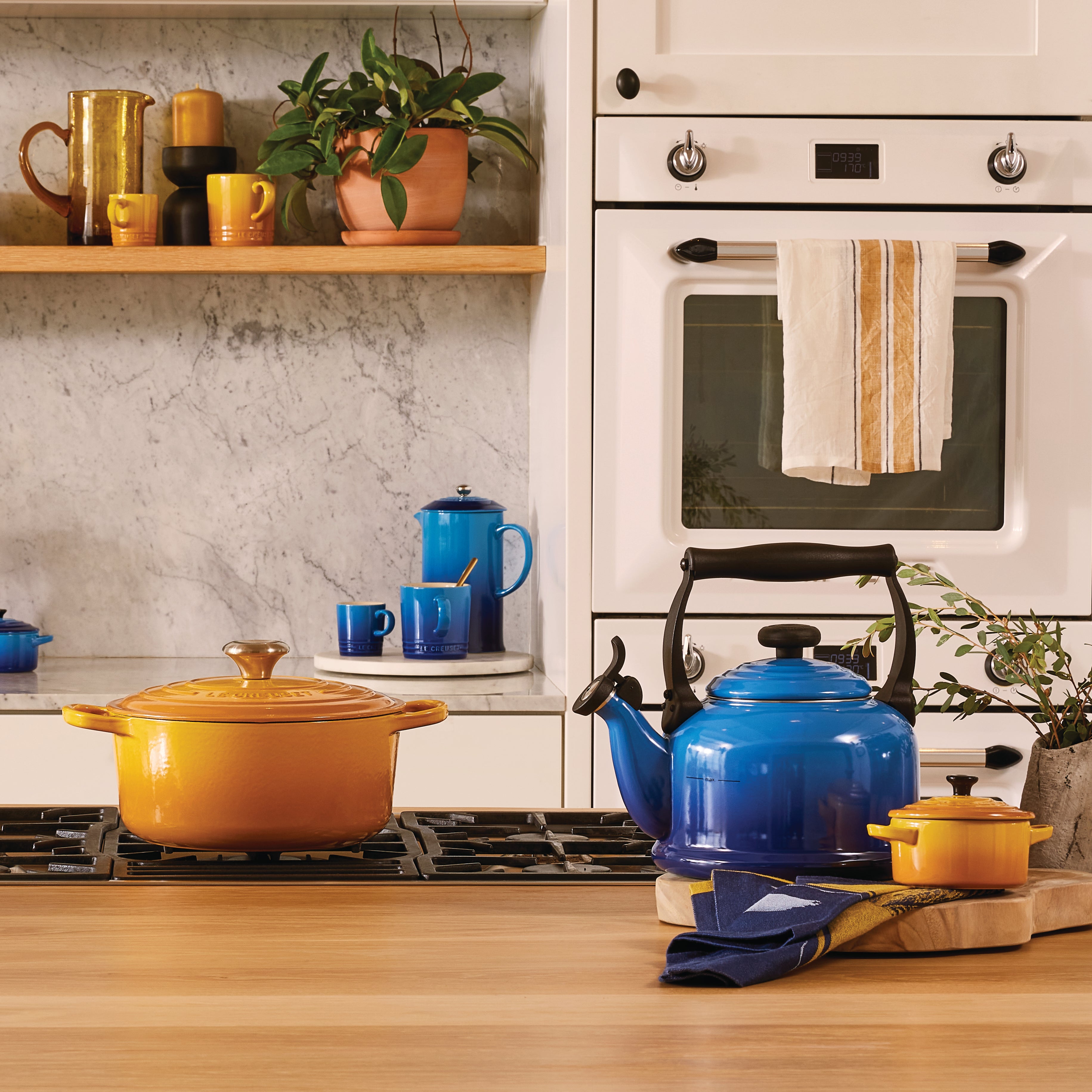 Nothing beats the aroma of freshly brewed tea or coffee, and such an important daily ritual calls for a stylish stovetop kettle. Whether you prefer a traditional or modern design, Le Creuset enamelled steel Traditional, Whistling and Kone Kettles will make a colourful addition to your kitchen. Each kettle is crafted from high quality steel with a vibrant, durable, vitreous enamel finish that will complement your Le Creuset cookware perfectly.