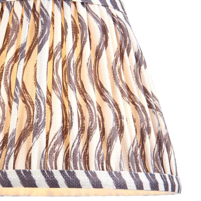 20cm tapered shade with white gimbal. Ripple pattern in pearl grey colour with taped edge detailing and plain inner lining. Perfect when paired with one of our beautifully decorative table lights, wall lights or chandeliers.