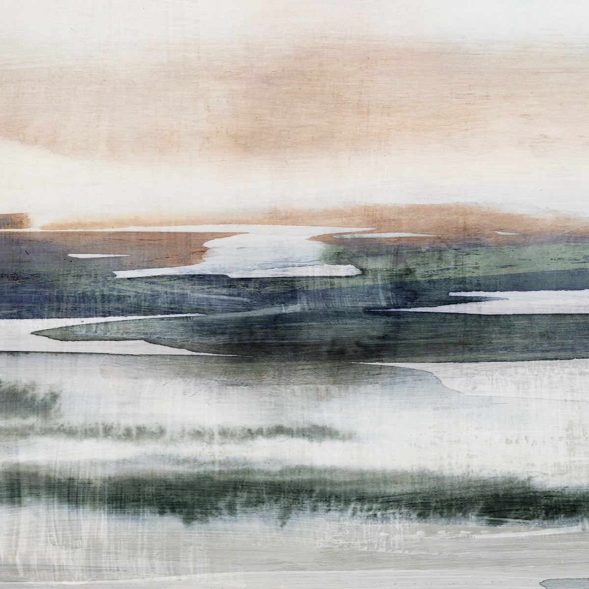 An immersive coastal experience. An abstract print that collaborates a variety of soft hues to create dramatic effects of a shoreline.