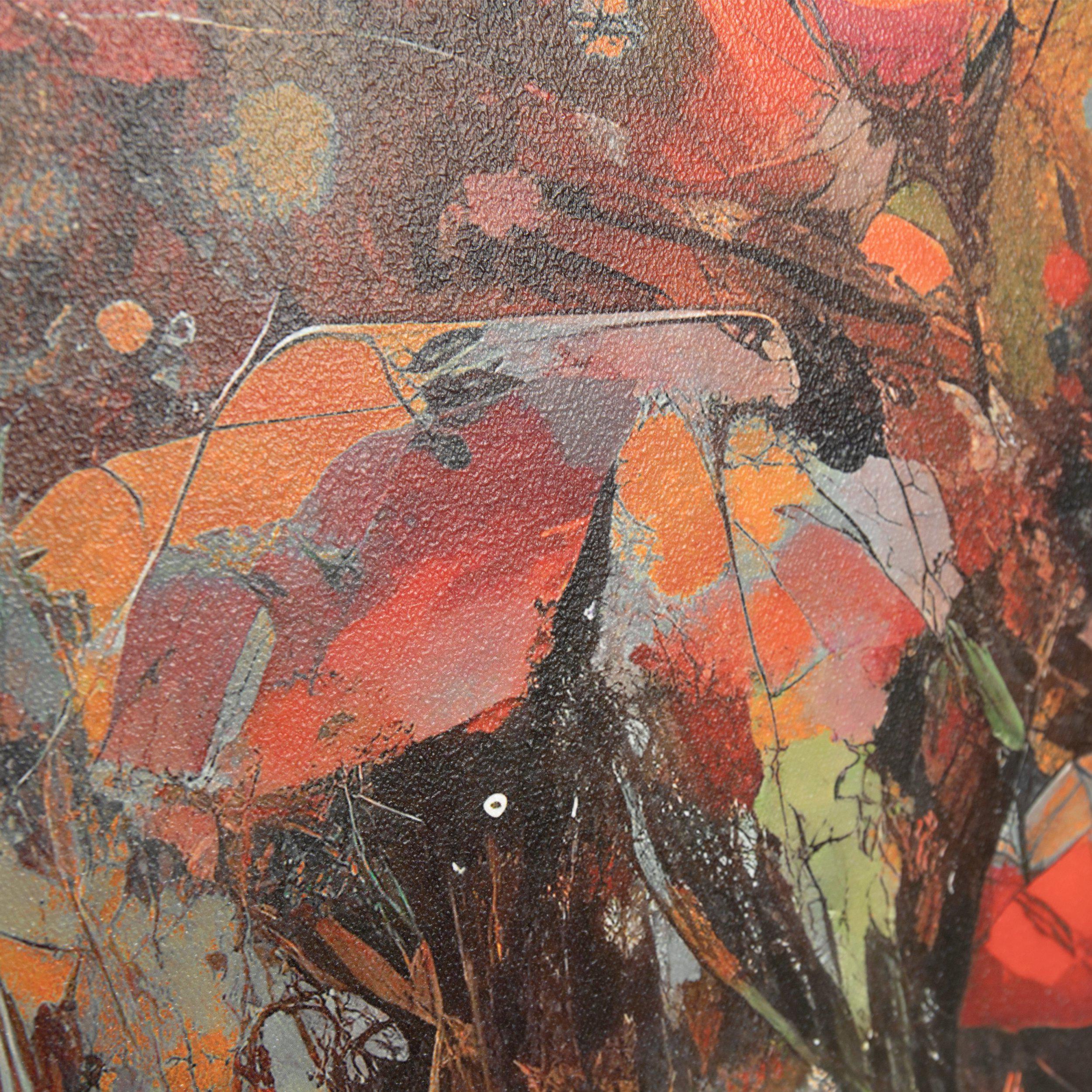 A faint path weaves through the wild meadow as wanderers leave their trail behind. Mellow reds, yellows and oranges create an exuberant scene of escapism. The unglazed canvas wall art uses a mink wood effect profile to complete the presentation.