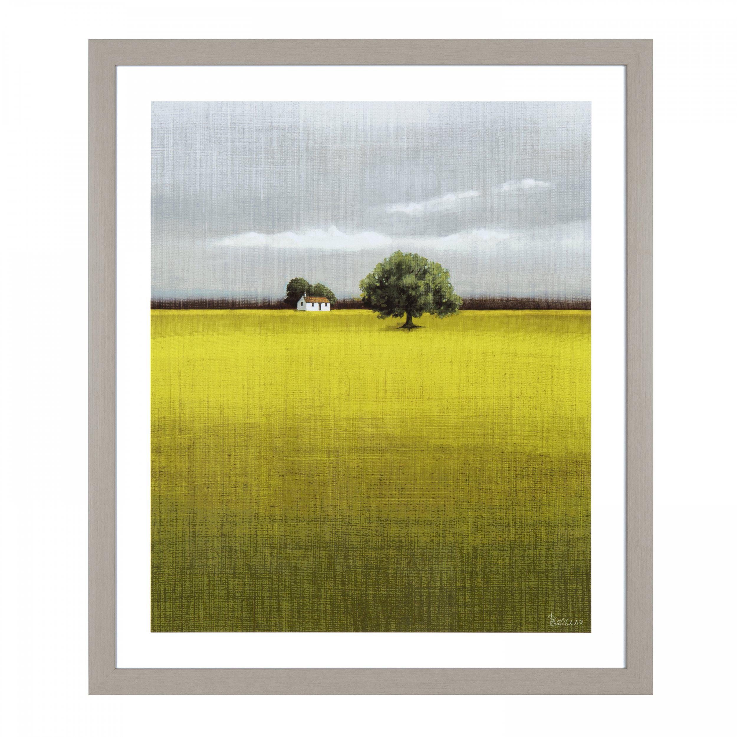 The moody sky against the warmth of the crop field creates a juxtaposition of emotion. A lone farmhouse on the horizon makes the divide between the two expressions.