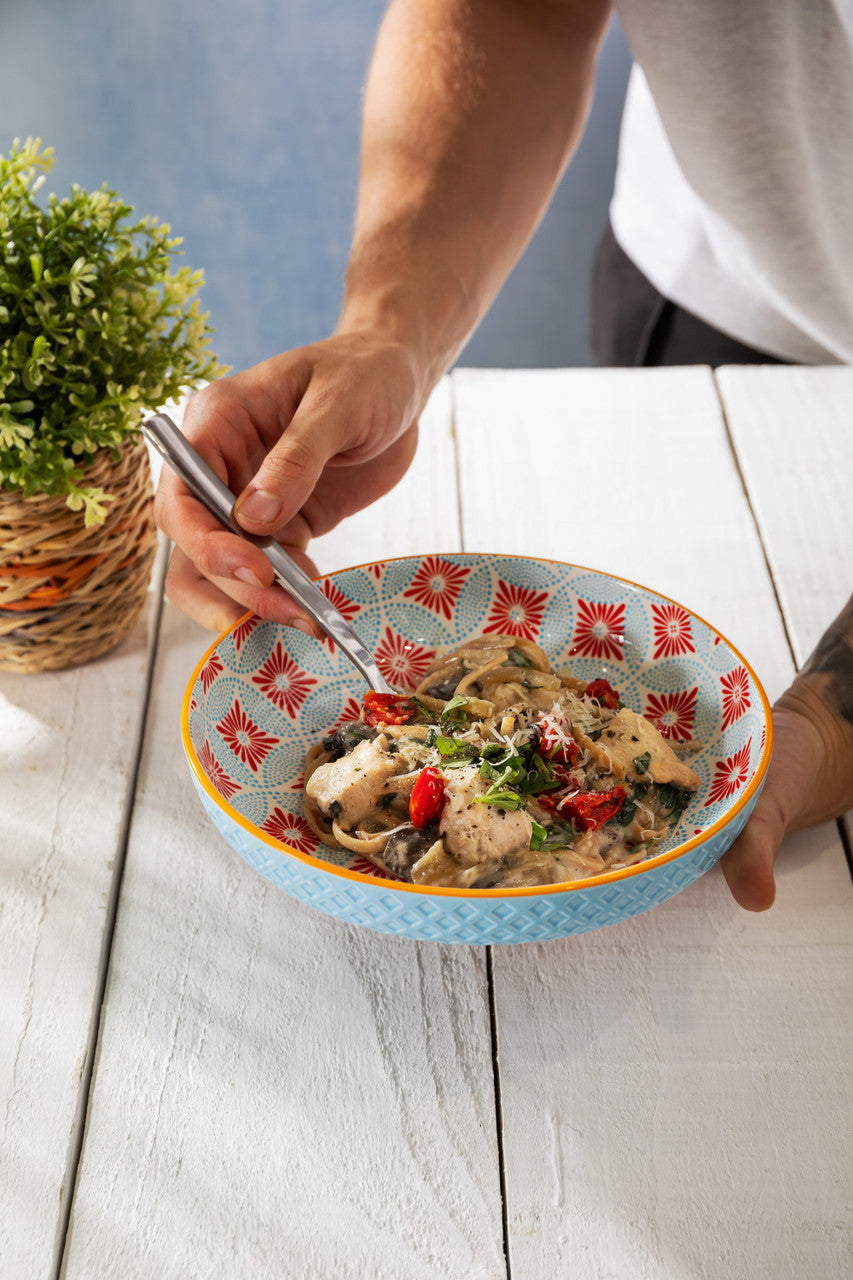 Vibrant stoneware bowls with a shallow design, this versatile bowl is perfect for serving pasta, stews, salads, stir-fries, and more. Add a touch of charm to your tablescape. Beautifully designed with eye-catching patterns, this bowl is perfect for everyday meals and special occasions. It is designed for convenience and is microwave and dishwasher-safe, making it easy to use and care for.