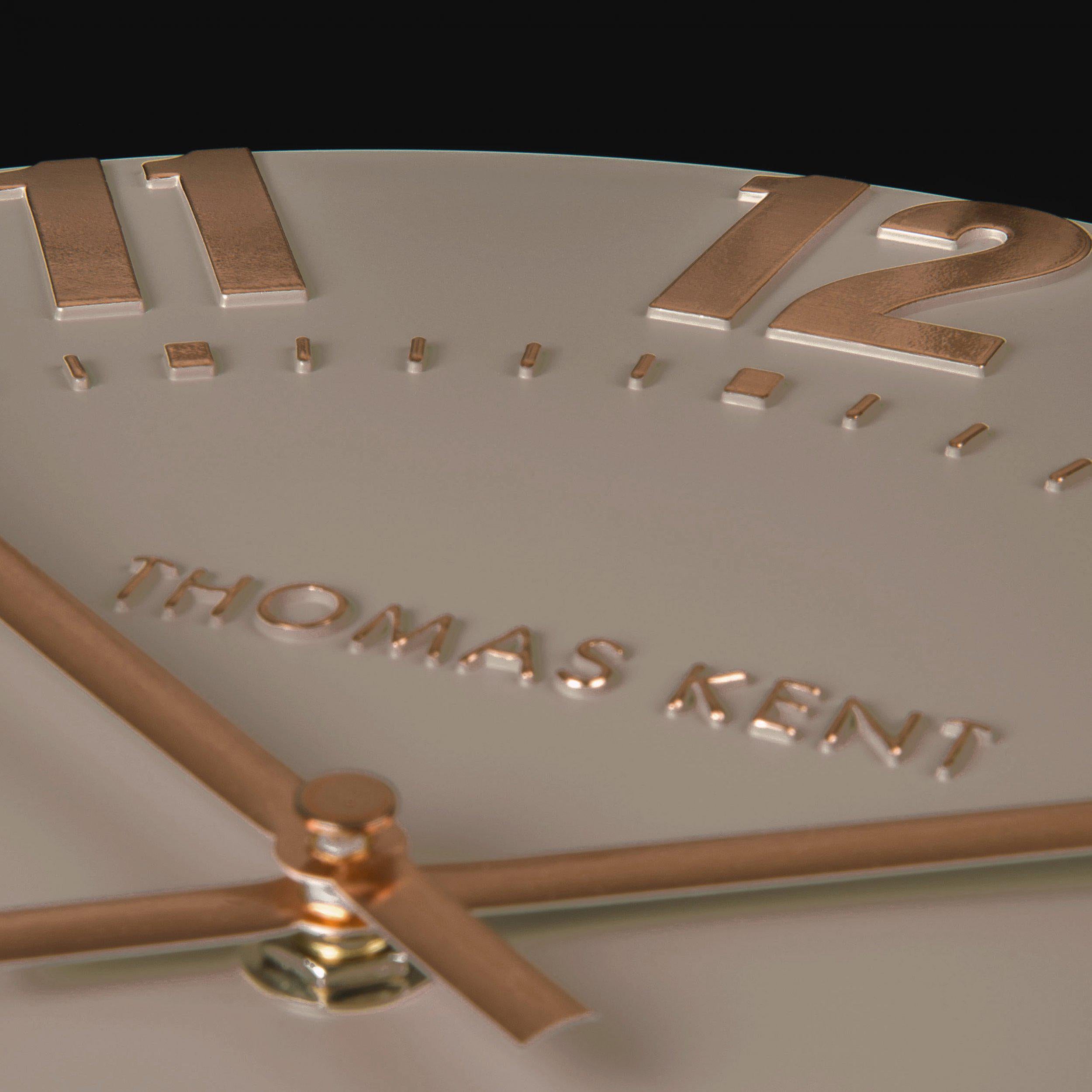The Thomas Kent Mulberry wall clock takes a classic timepiece and transforms it into a modern statement piece. The 12-inch dial pronounces proudly a captivating curve. An inviting shade of taupe creates a warm aura. The rose gold ticks, hands and numerals catch the eye.