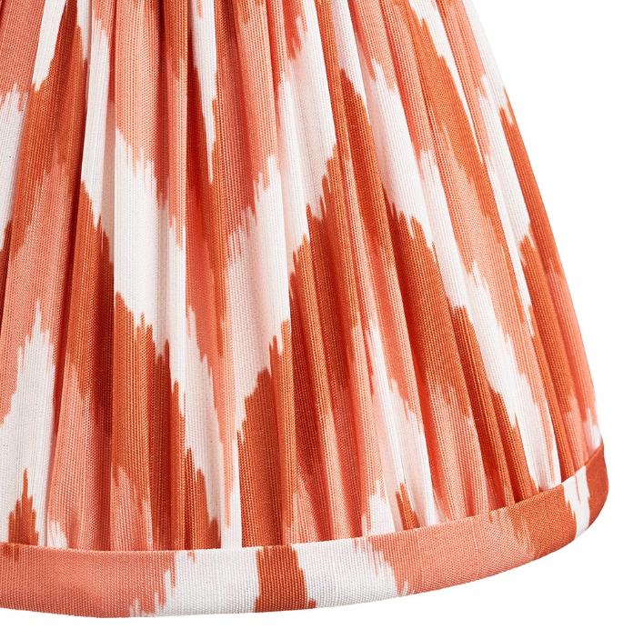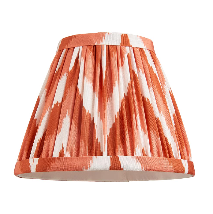16cm tapered shade with clip gimbal to fit golf or candle. Zigzag pattern in an apricot orange colour with taped edge detailing and plain inner lining.