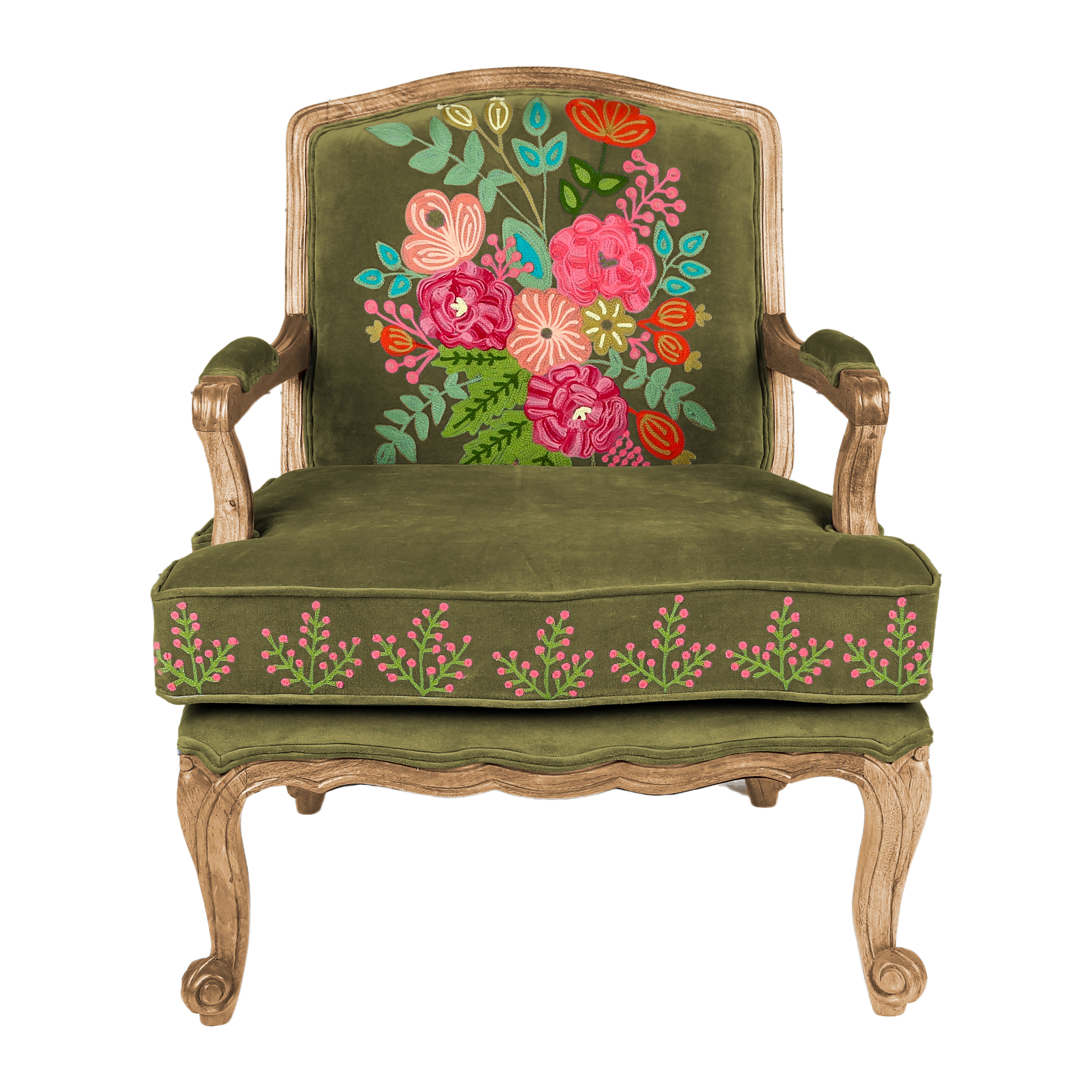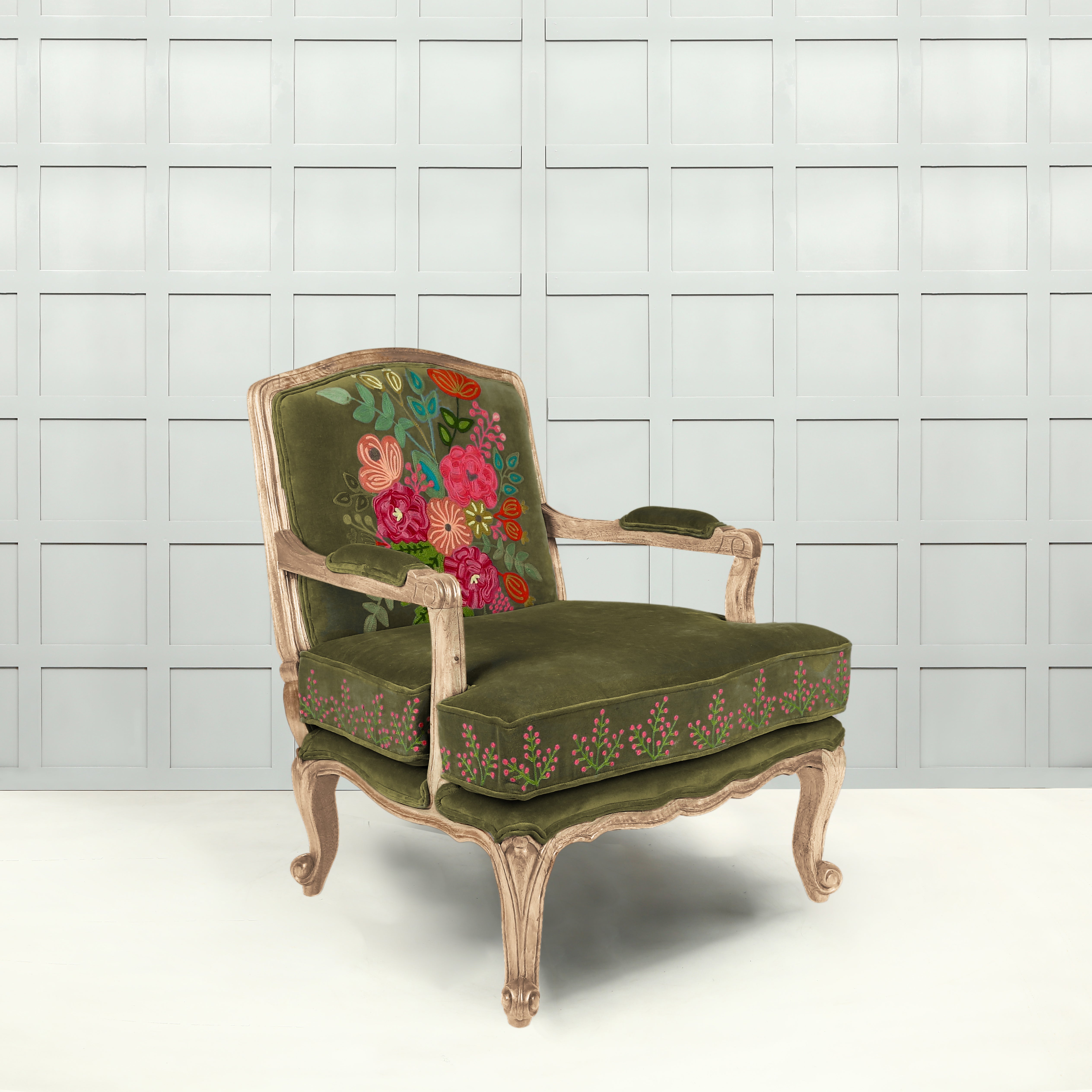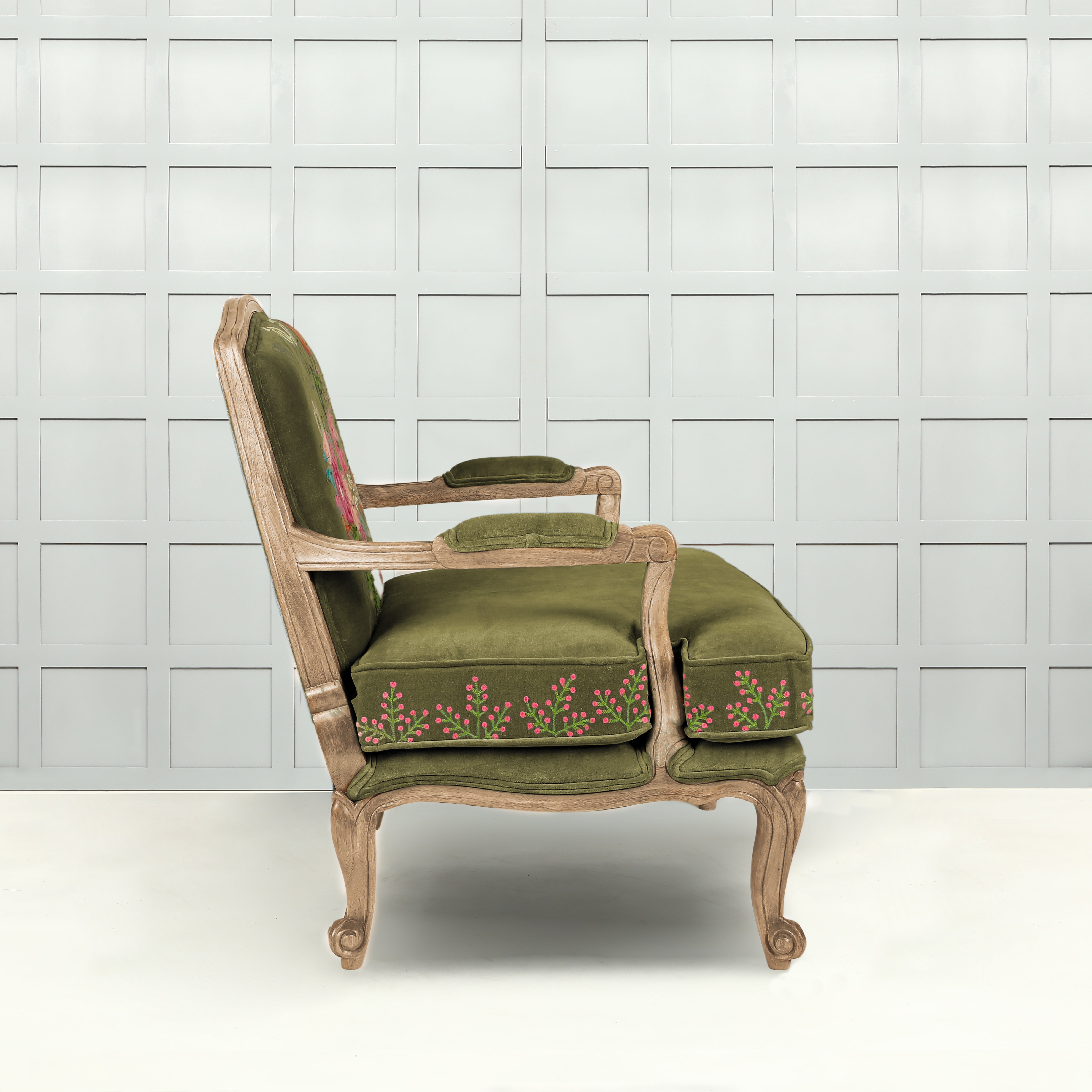 Experience timeless luxury with the Agnetha armchair. This carved chair features a soft grass green velvet finish and vibrant embroidered floral design, making it a stunning addition to any space. With dimensions of H83 x W77 x D76 cm, it's the perfect combination of style and comfort.