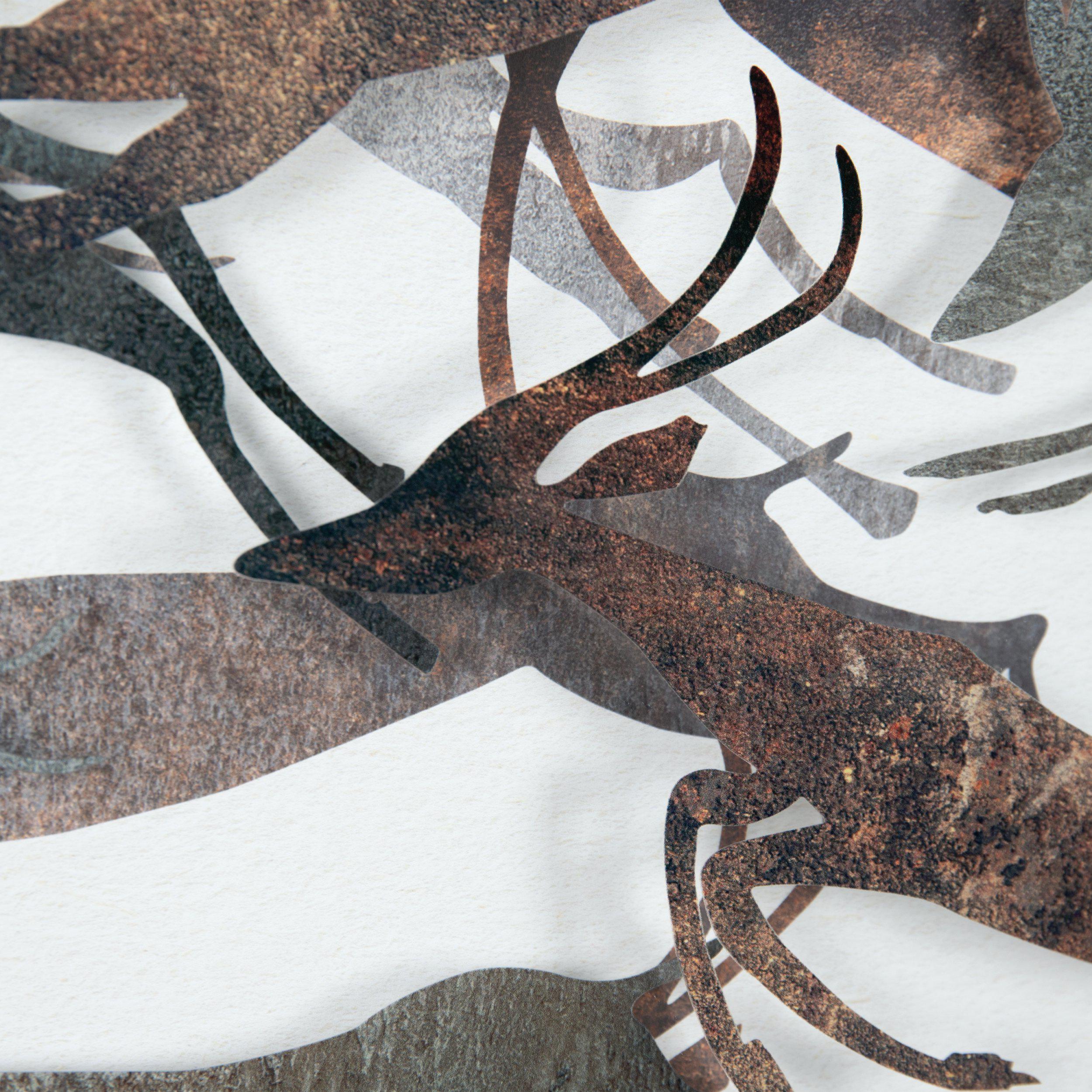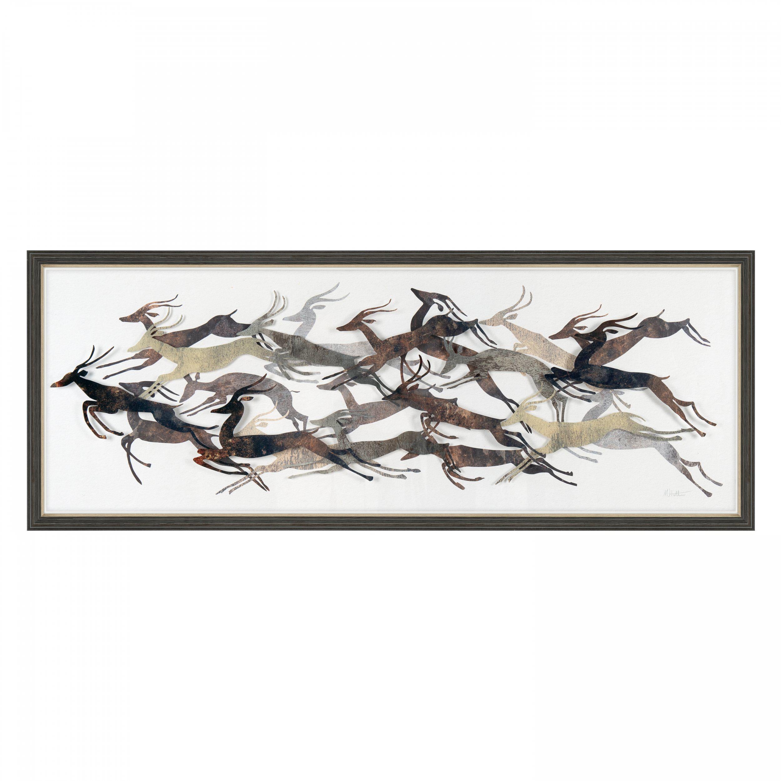 A herd of majestic gazelles’ leap in unison. Varying shades of brown depict the slender yet powerful body of the small antelope. Joyful in their appearance Mark Hather captures a variety of hurdle positions to seize the true beauty of this graceful animal. Carefully layering the graphics over multiple opaque sheets adds greater depth to this contemporary feature piece.