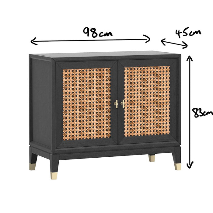Introducing Bethany, the quirky and stylish sideboard with black wood and rattan door fronts. Measuring 98x45x83cm, this 2 door sideboard adds playful functionality to any room. Keep clutter at bay and elevate your decor with this unique piece.