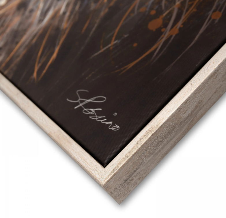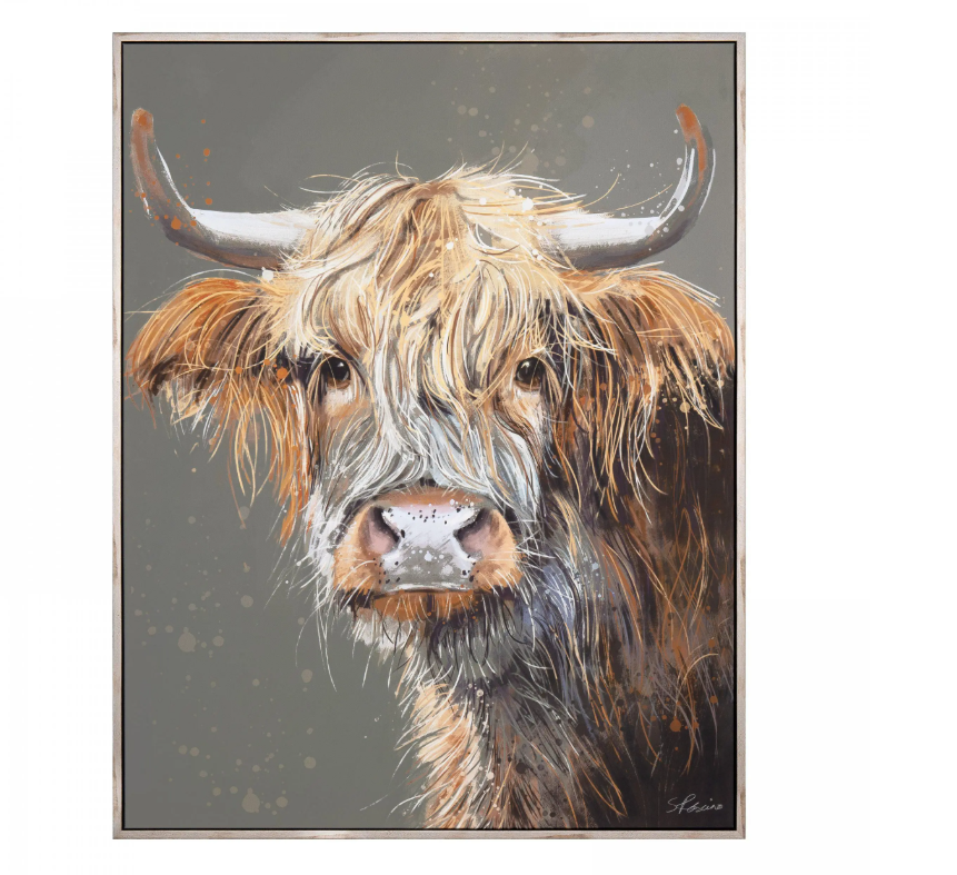 Sabrina Roscino skilfully captures the unique charm of a Highland cow, drawing you in with the contrast between its gentle, curious stare and the wind-blown textured hair that reveals a delightful suite of rustic tones. The minimalistic warm grey backdrop allows for the portrait to take centre stage. Careless splashes of paint add to the wild allure. The delectable animal is meticulously illustrated on canvas. A metallic wood effect frame adds a touch of glamour to the overall composition.