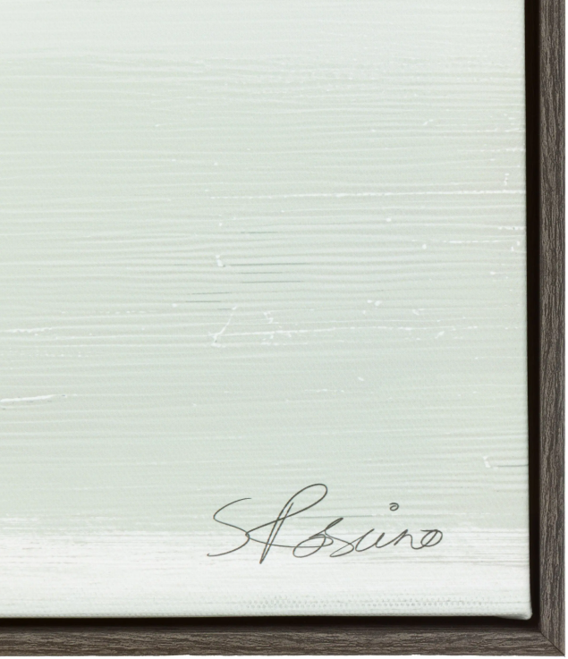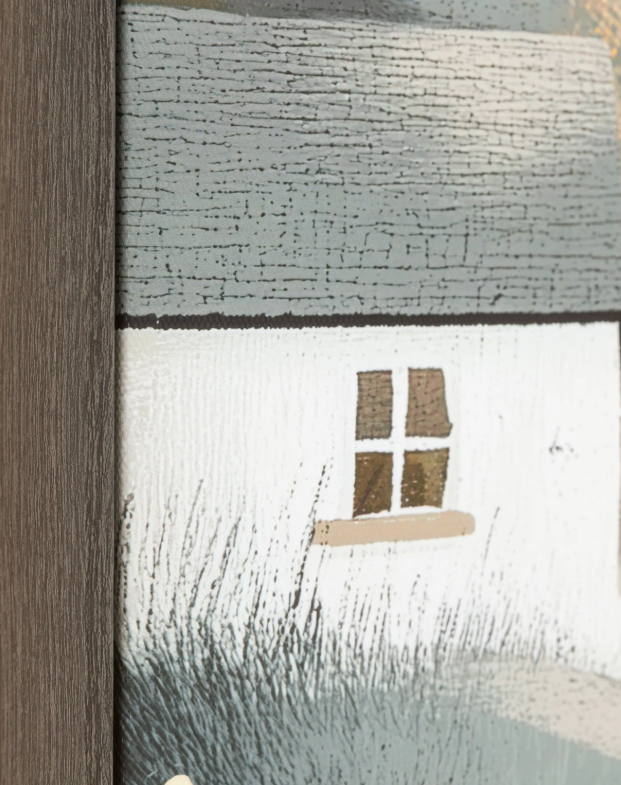 Escape to the calm of a seaside cottage. The tranquil, pale blue sea fills the canvas in this painting, while a small sailing boat enjoys the calm waters, a picturesque cottage watches over, evoking a feeling of peace and escape from everyday life. Surrounded by a mottled pewter frame.