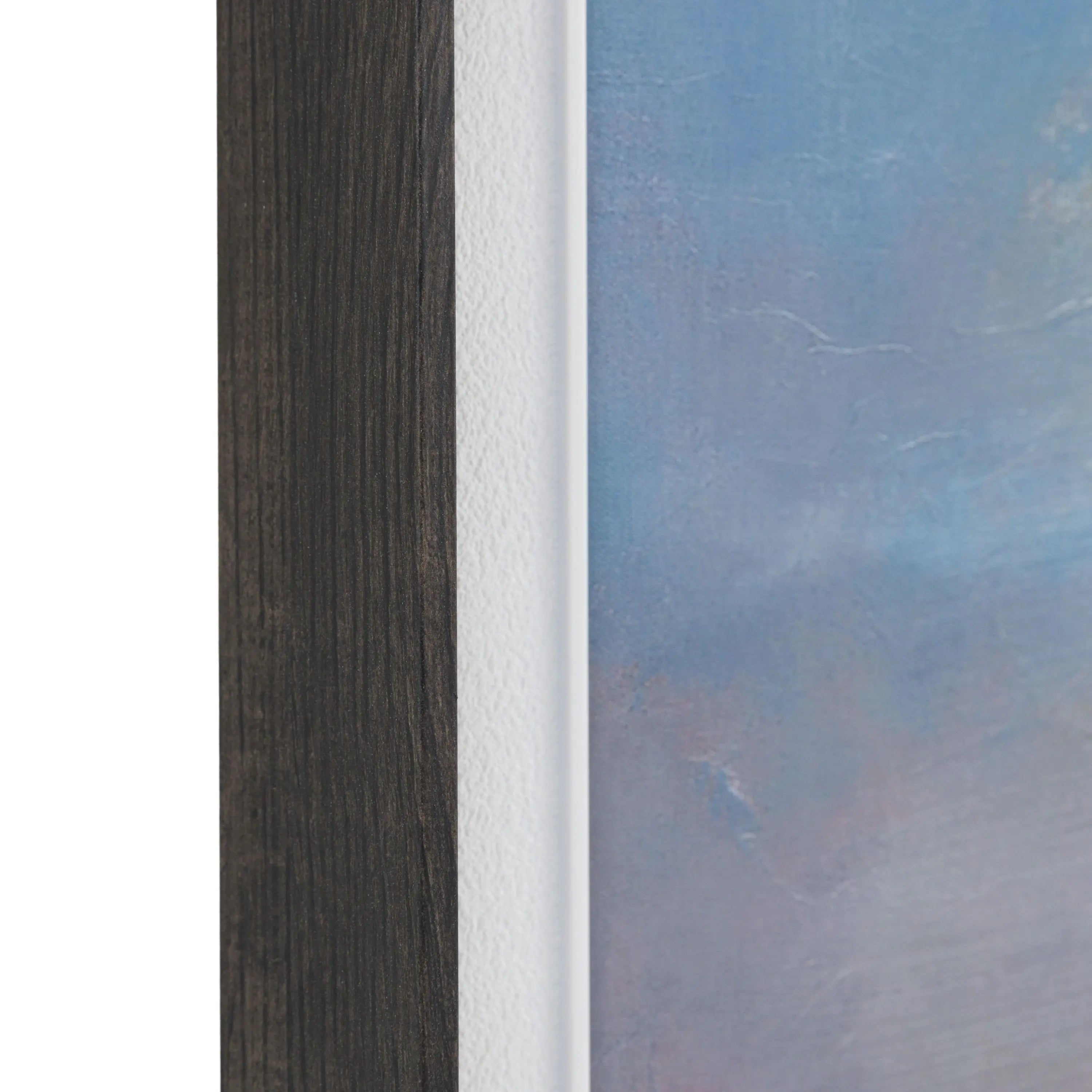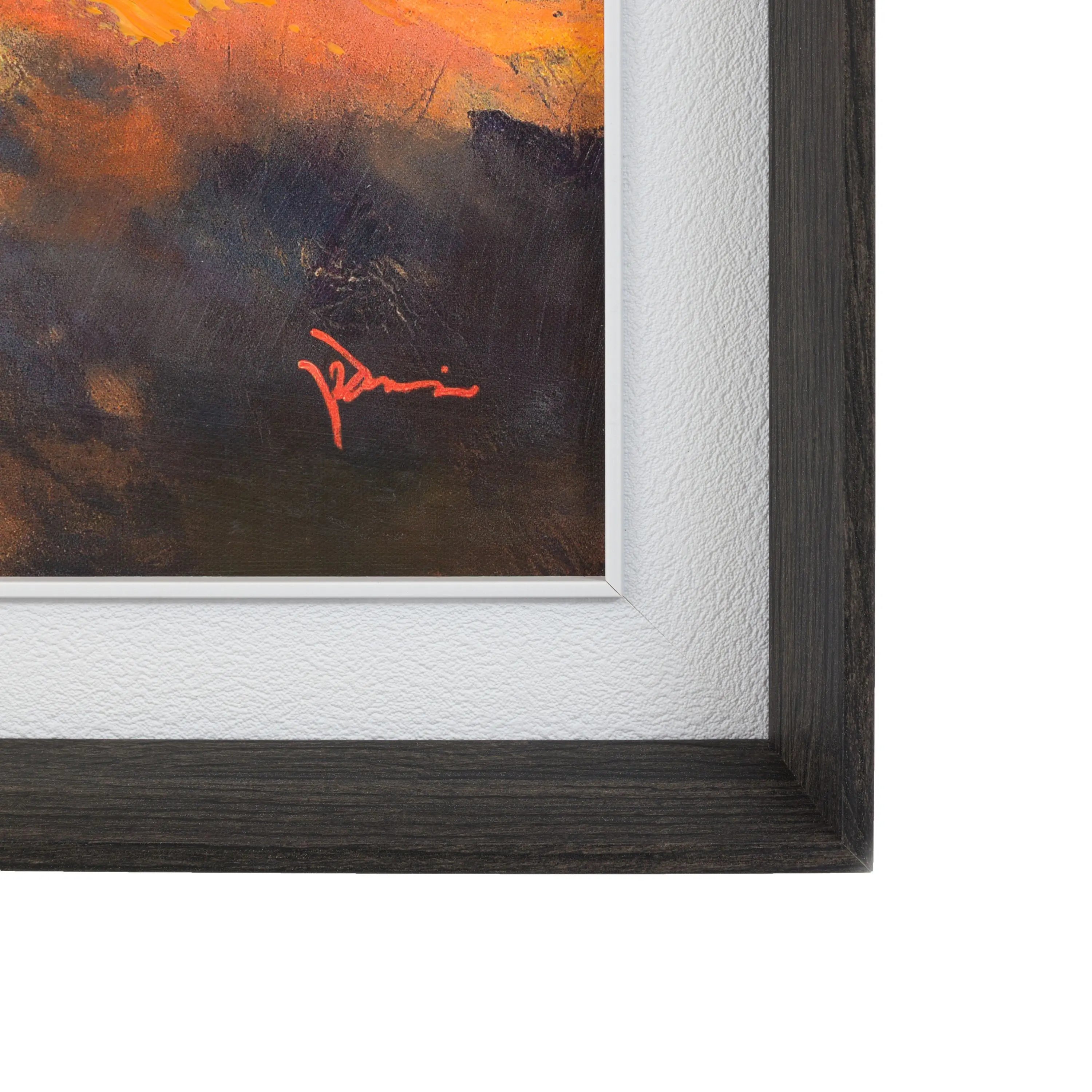 A vivid and dynamic seascape where deep blues and fiery golds meet beneath a sweeping sky. The artist's bold hand painted brushwork and layered texture create a tactile surface with a natural warmth which captures the shifting energy of sea and light, evoking the drama of a coastline illuminated by the last glow of sunset.