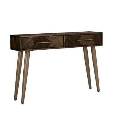 Stunning dark wood console table with gold effect detailing and two storage drawers for convenience.