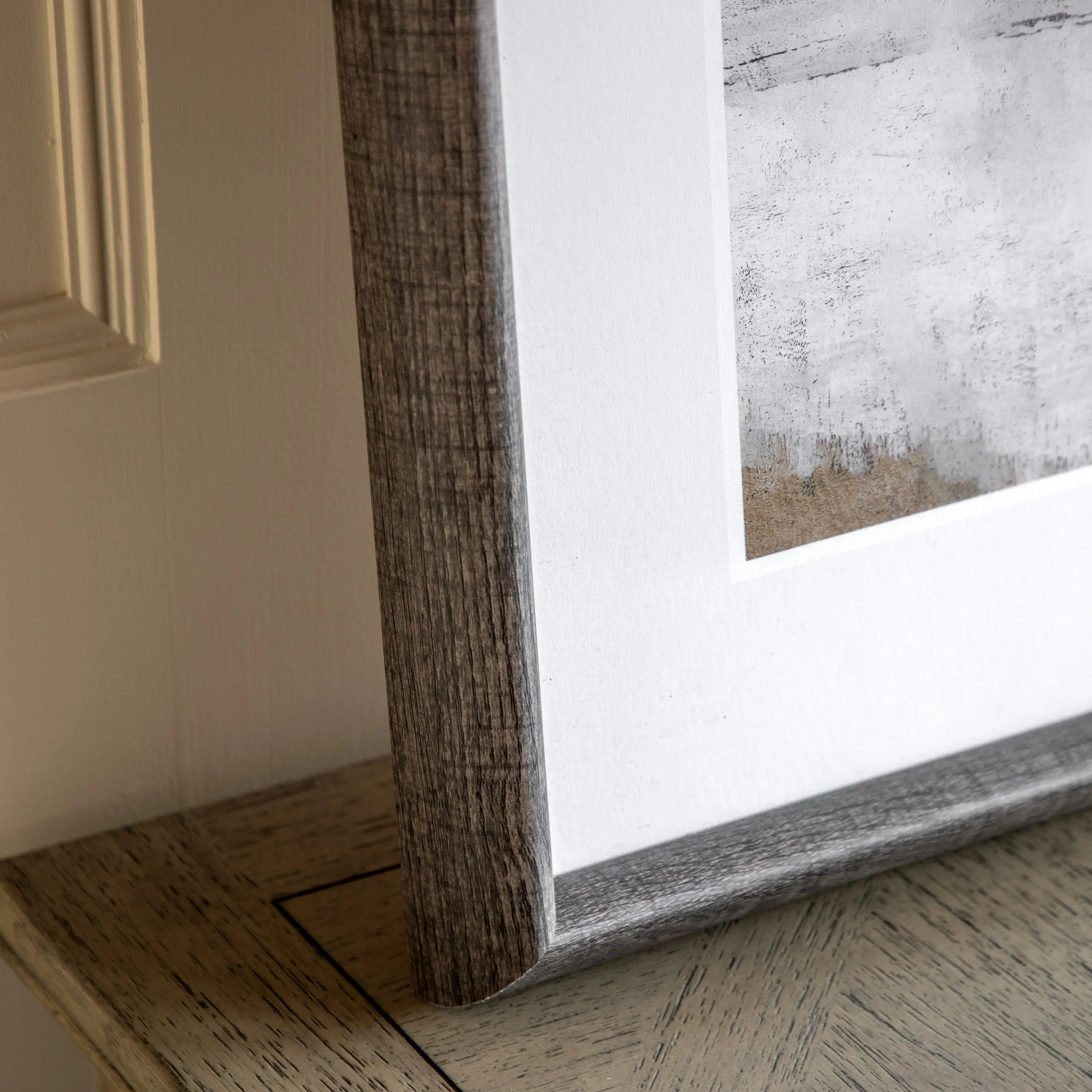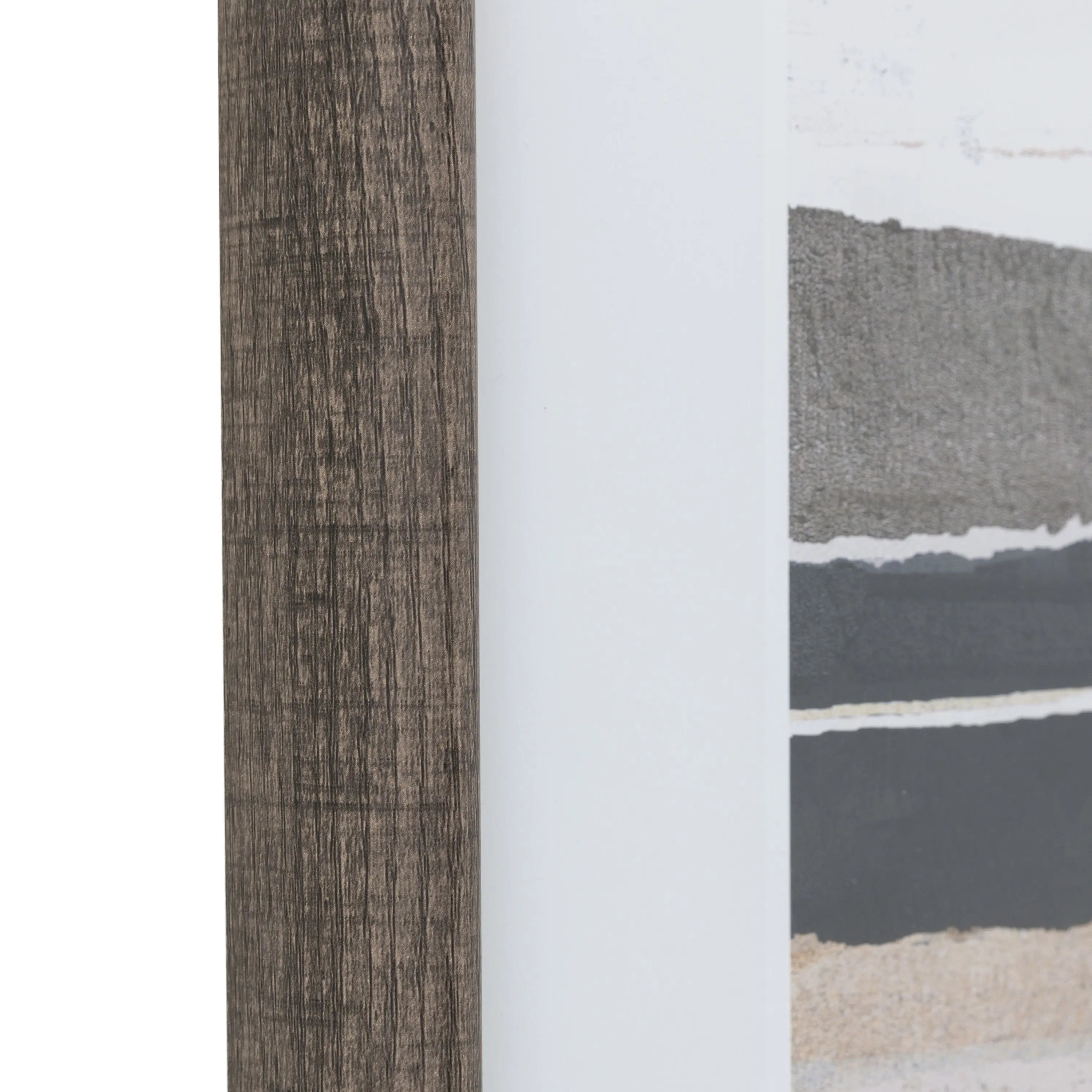 A sophisticated pair of abstract landscapes featuring soft horizontal layers in natural shades of grey, taupe and charcoal. The gentle textures and tonal balance create a calming, modern aesthetic. Framed in dark weathered oak finish frame, these artworks bring a sense of tranquillity and understated elegance to any interior space.