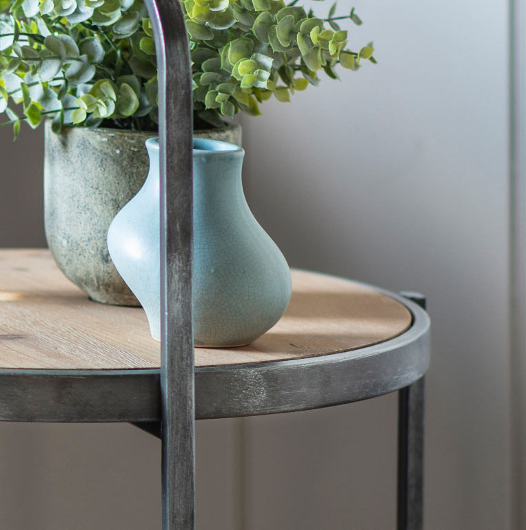 Contemporary side table crafted from metal with an antique pewter finish combined with a fir veneer top and shelf with a natural finish with a light wash to highlight the grain of the wood.