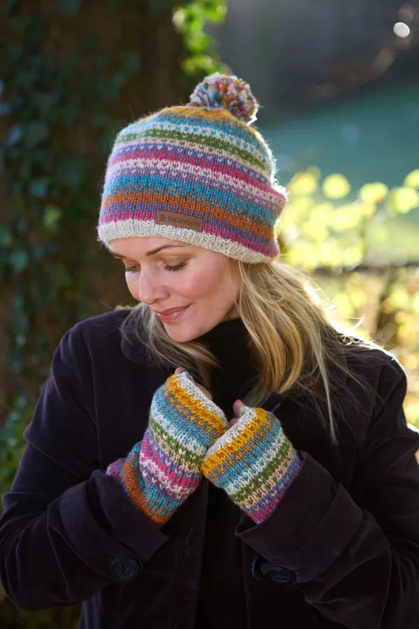 These bobble hats are fleece lined around the forehead to keep you extra warm.Women's hand knitted wool bobble hat, with pastel fairisle stripes, fair trade and handmade in Nepal.