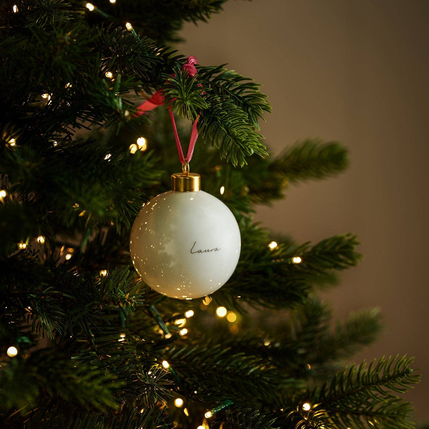 A timeless addition to your festive tree, this fine bone china bauble features Sophie's detailed illustration of Father Christmas and his reindeer on Christmas Eve. Hand-decorated in Stoke on Trent, and finished with a red velvet ribbon, it makes a beautiful keepsake for your own home or a thoughtful gift at Christmas time.