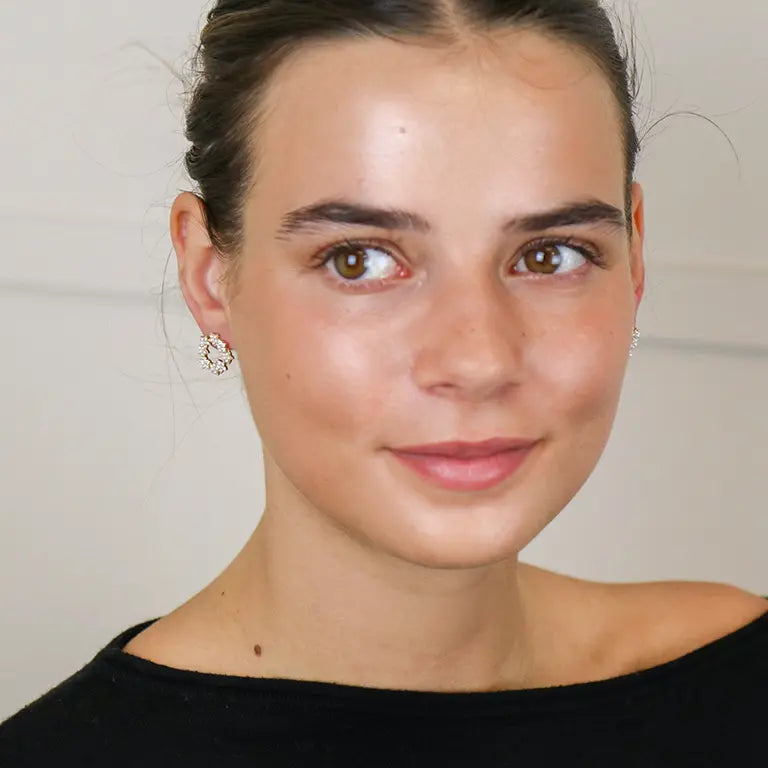 Faux gold plated floral circle stud earrings featuring alternate clear crystal and ivory pearl flowers.