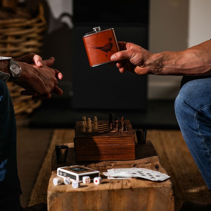 Enjoy a set of chess pieces, a pack of cards, five dice, and a beautiful pheasant engraved leather hip flask, complete with two accompanying cups and a hip flask funnel, all enclosed in a box with an intricately engraved chessboard lid.