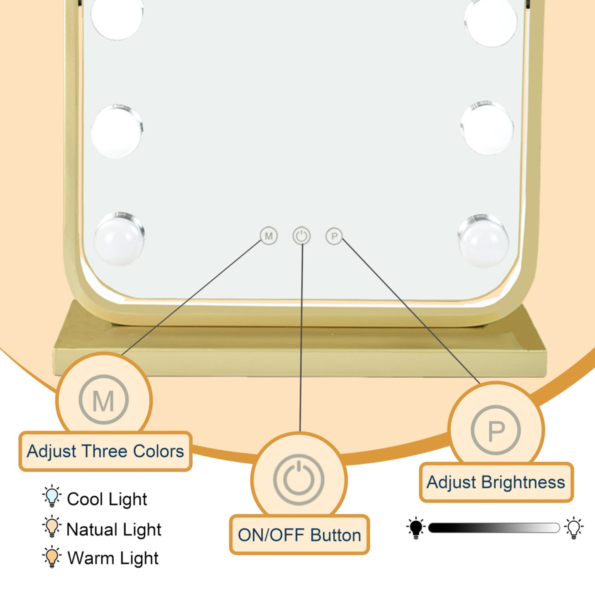 - The Hollywood Bulb Arch Vanity Mirror in Gold measures 40 x 30 cm and exudes elegance with its arch shape and gold finish. It features Hollywood-style bulbs surrounding the mirror