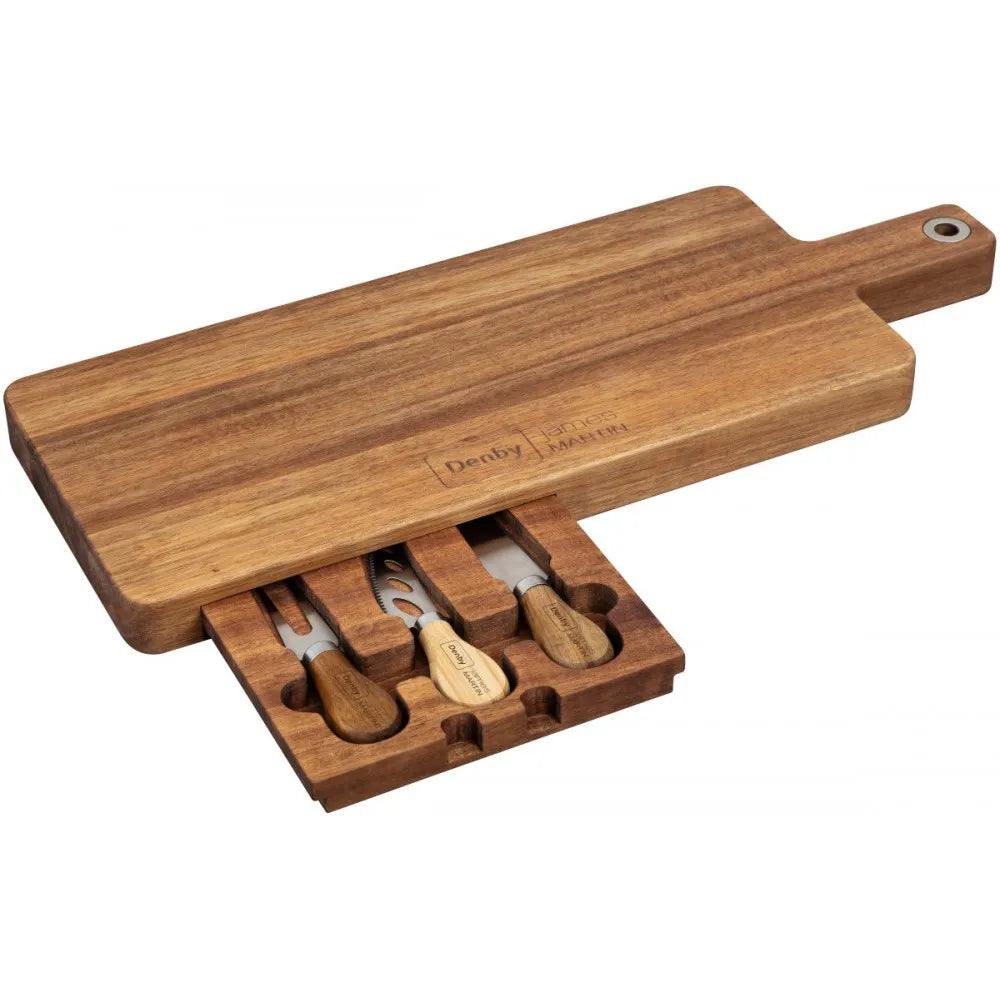 Indulge in the ultimate cheese experience with the James Martin Paddle Board. Expertly crafted with natural bamboo, it features a convenient pull-out section that safely stores three premium cheese knives. A luxurious addition to your kitchen, only for those over 18. Elevate your dining with sophistication.