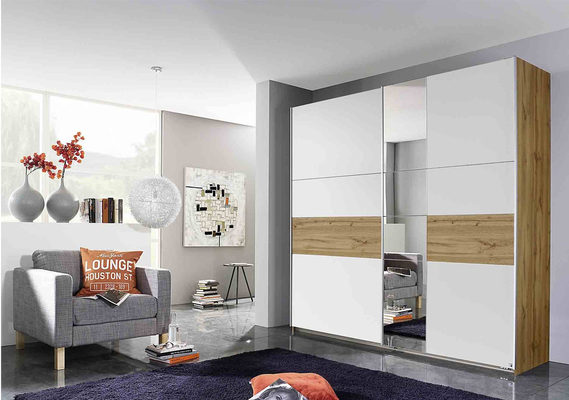 Kor is available in a choice of finishes, in either alpine white with Wotan oak front panels and sides or contemporary stone grey with metallic grey contrasts. Ideal for rooms where space is in short supply as the doors require no clearance to open, the sliding wardrobe comes as a flat pack for easy access to your home. Kor range has matching bedside and chest of drawers available separately to complete the look.