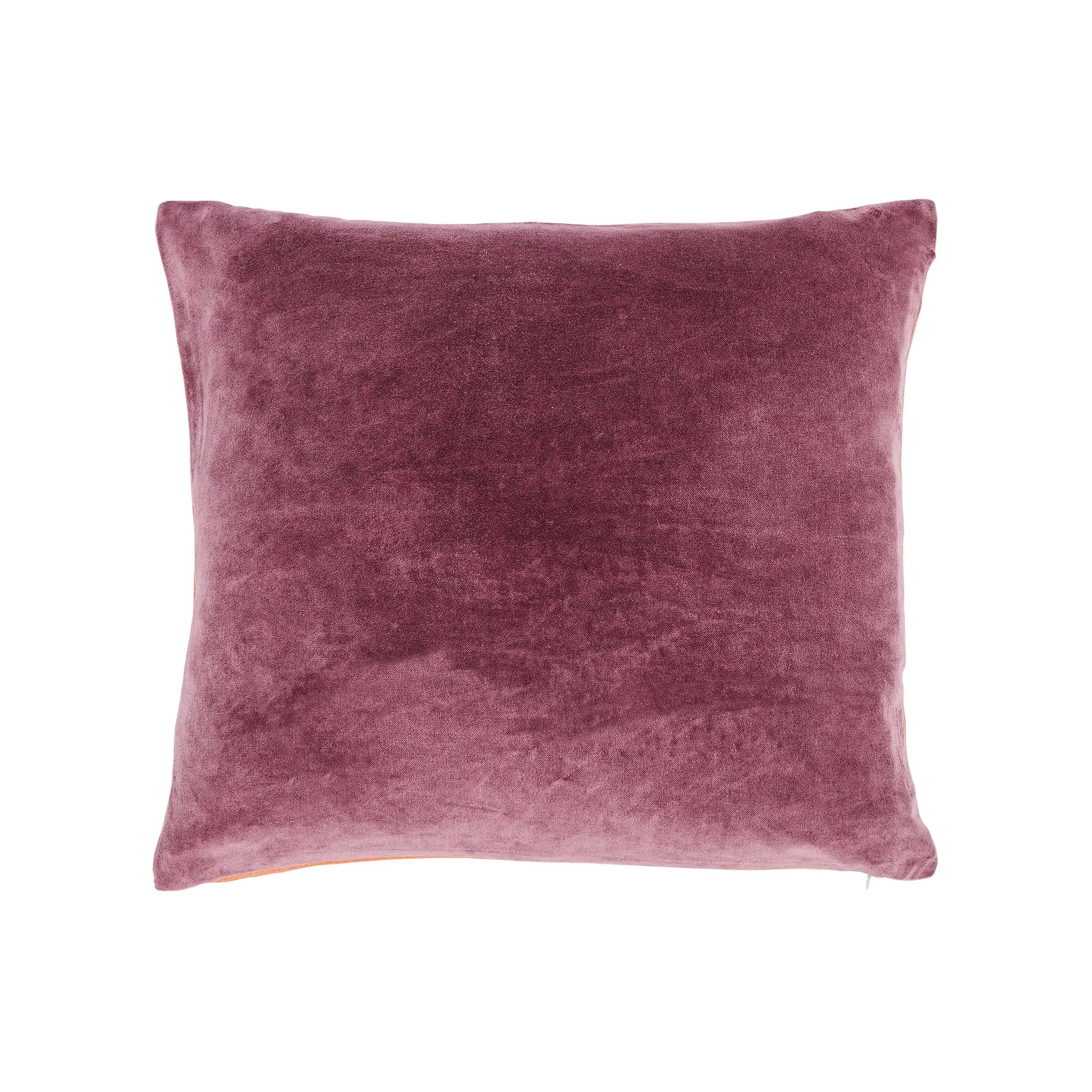 A beautifully plush velvet cushion in deep mauve with a plain cotton slub reverse in orange.