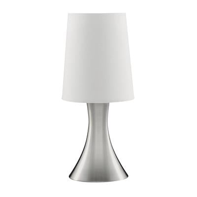 This satin silver touch lamp complete with white tapered shade is perfect for lighting your bedroom, living room or dining room. The lamp is short and stylish with a sleek, modern satin silver finish funnel base and white fabric drum shade. This is also touch sensitive, with low, medium and high