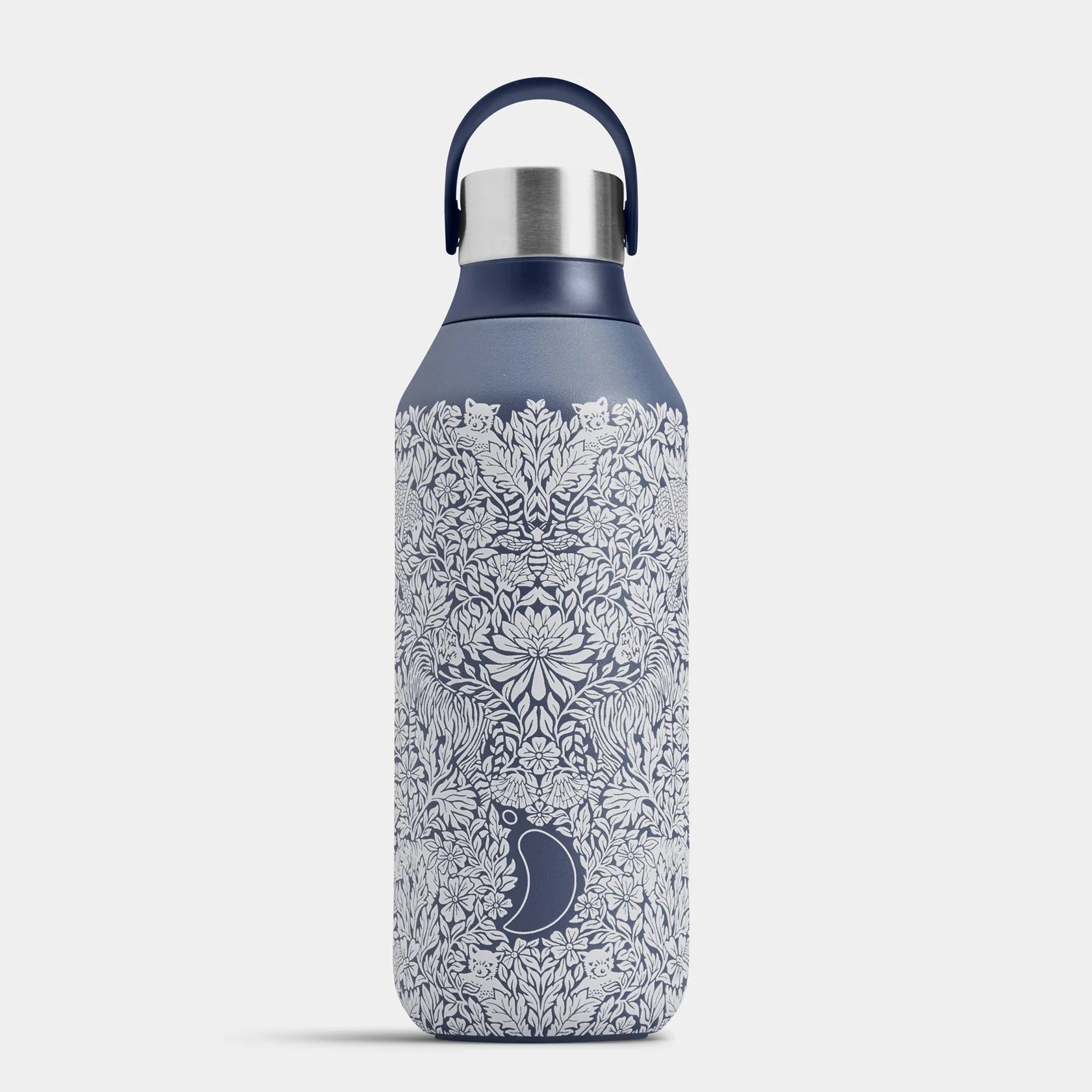 A Stainless steel water bottle by Chilly's in a blue and white pattern, a perfect alternative to plastic bottles.