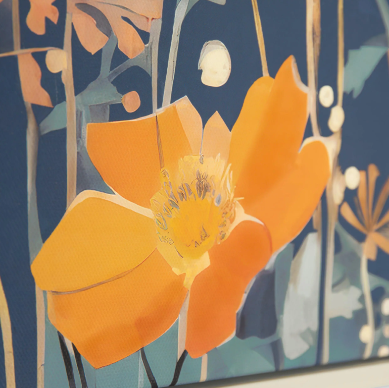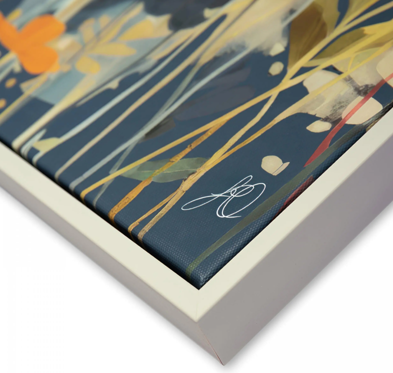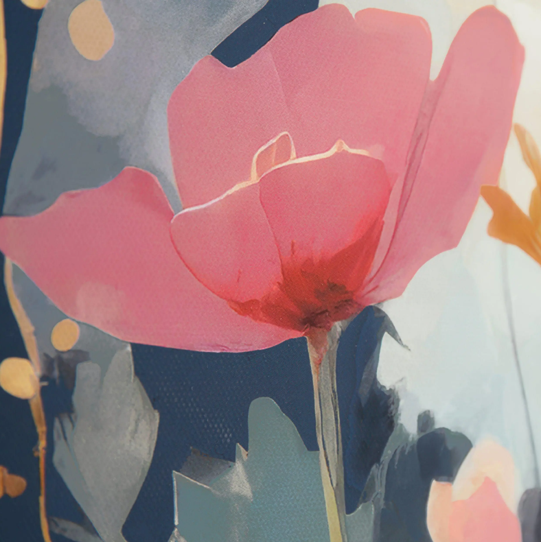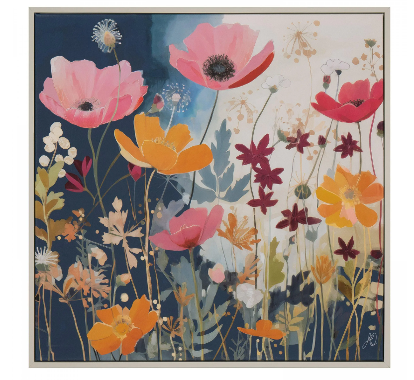 A stunning meadow of wildflowers bursts with vibrant pastel hues, celebrating the joys found in summer. A contrasting backdrop of ink blue and muted oatmeal creates a beautiful melody for the bloom to sit upon. Faye Reynolds-Lydon, with her delicate watercolour technique, intricately details each petal, adding subtle hints of texture and shading that bring extra depth and dimension to the artwork. The canvas wall art is elegantly framed in a modern grey frame, adding a contemporary touch to the design.