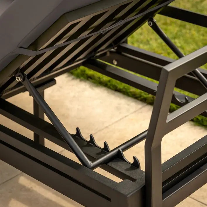This chic grey chaise corner lounger set includes a 3 seater sofa with a raising end that doubles up as a sunlounger. A footstool completes the corner sofa and gives you flexibility. The chic coffee table finishes off the set and like the lounger is made from an aluminium frame finished off with a teak table top.