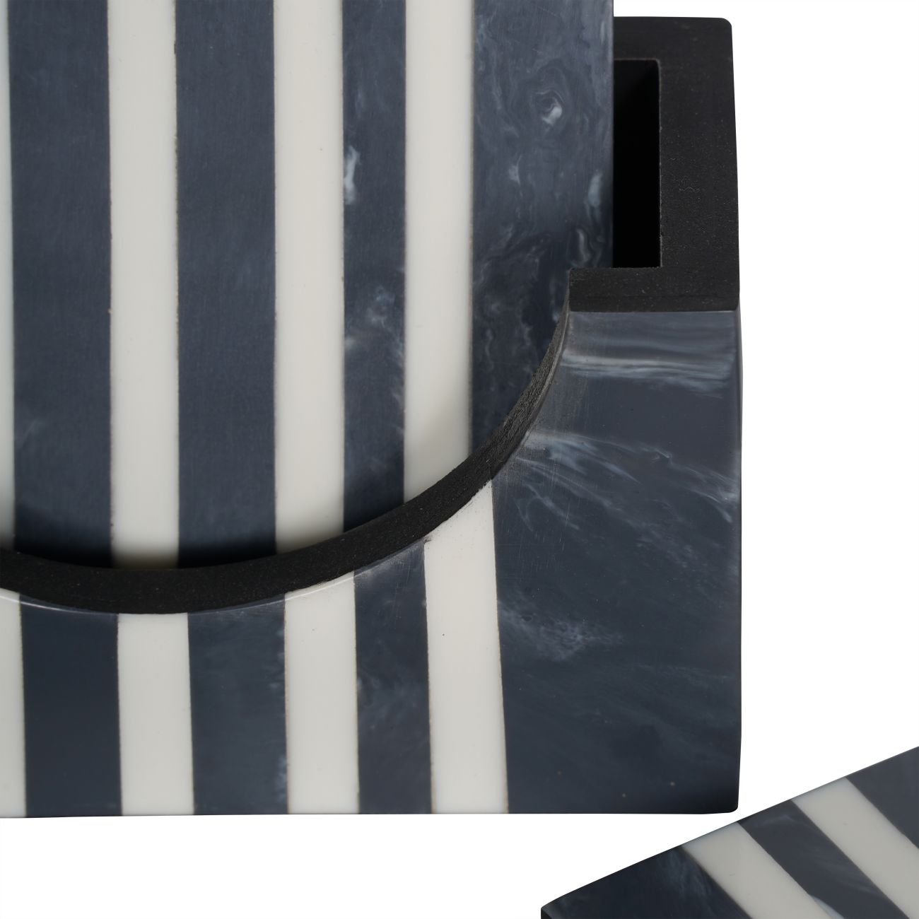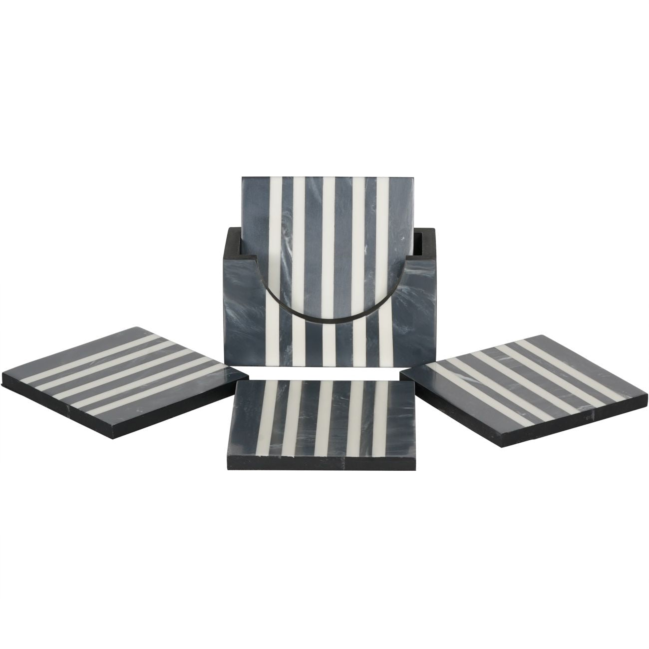 This set of four grey and white coasters comes with a convenient storage stand to keep them organized and easily accessible.