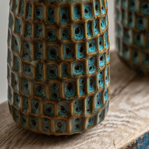 These intriguing vases can't help but grab your attention, wherever they are placed. The grid texture is finished in rich teal and brown reactive glaze for a perfect artisanal touch.
