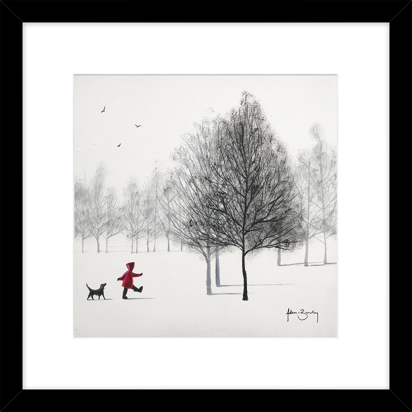 A simple yet memory provoking picture of a child with his dog walking in the snow.
