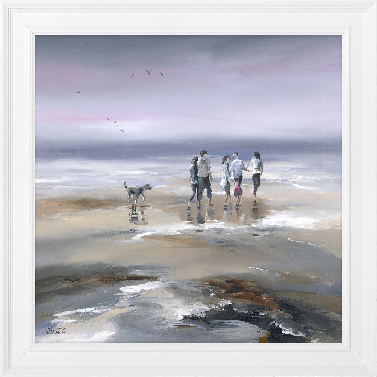 Capture fun memories at the beach with "Sharing Moments" by artist Janet Gammans. This 59cm x 59cm print features 5 people (and a furry friend) in a playful moment. Perfect for adding a touch of whimsy to any space!
