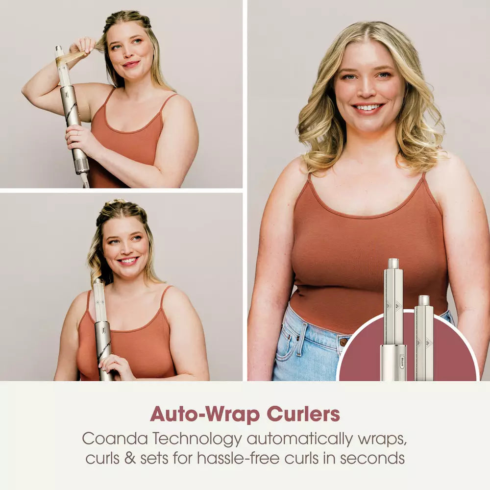 - Auto-Wrap Curlers: Change the way you curl. Coanda Technology wraps, curls and sets automatically, using air power to wrap hair around the barrel. Watch the magic happen as you place your hair near the barrel, creating hassle-free curls in seconds. With two curler attachments, curl your locks in both directions for a flattering, face-framing finish.
