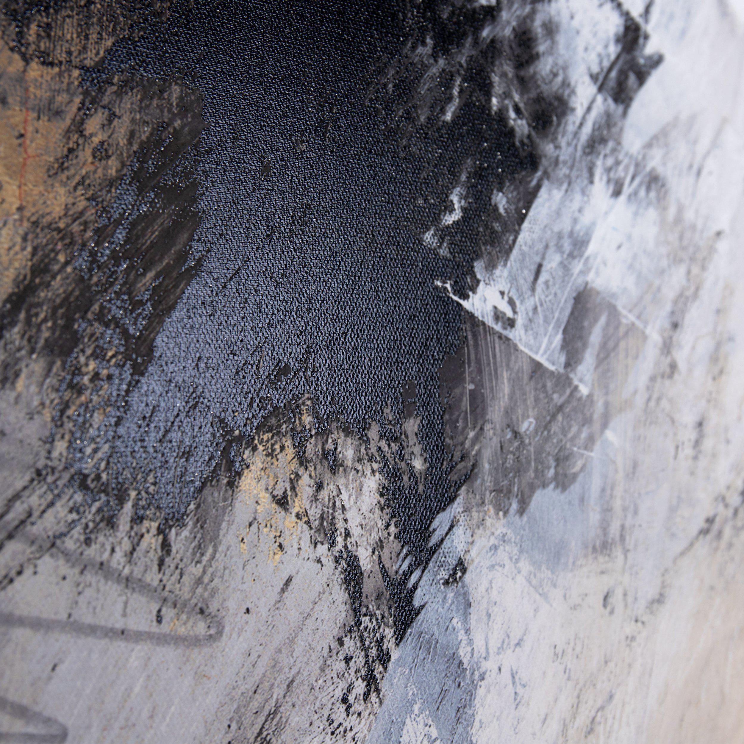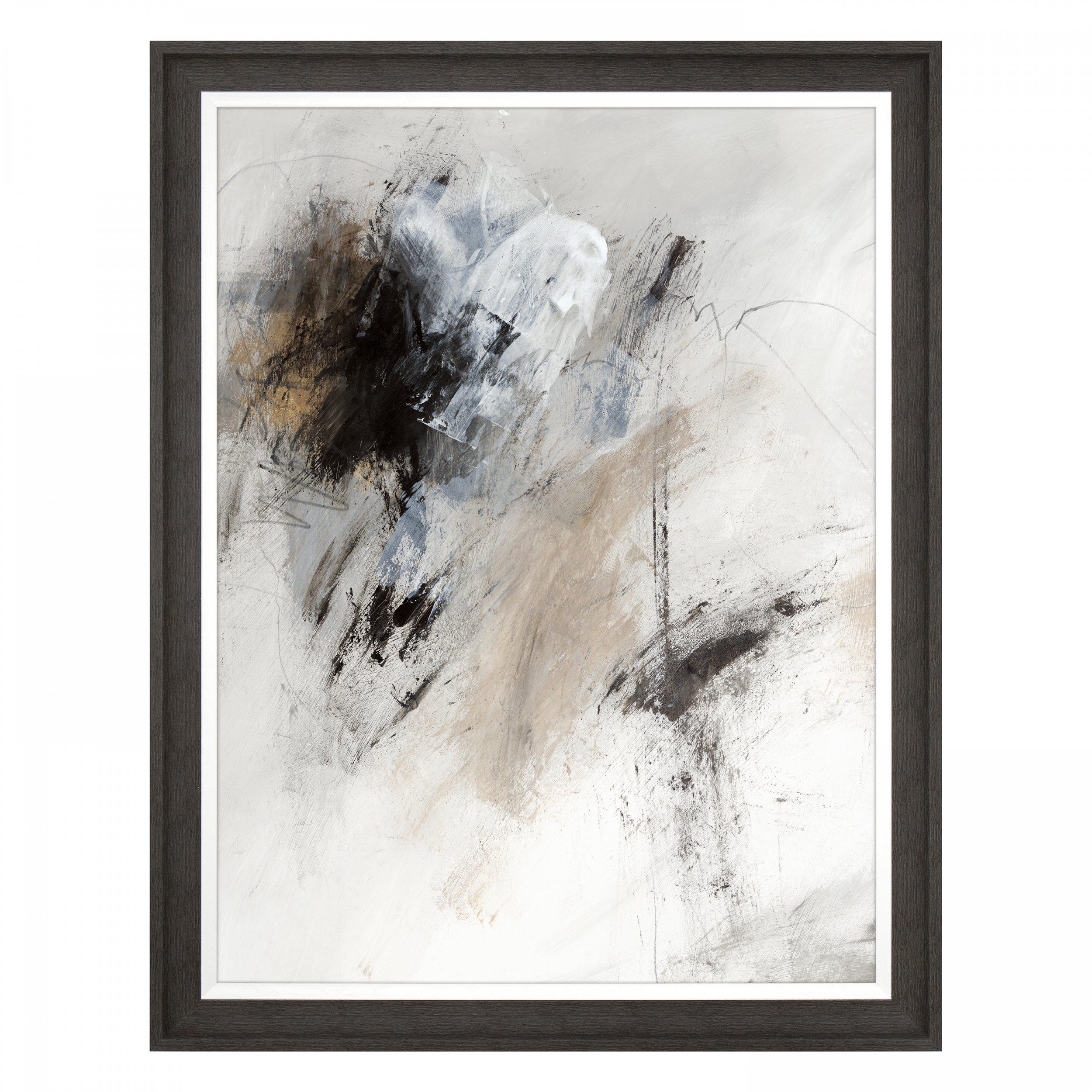 An abstract statement that focuses on the texture and movement of a host of bold brush strokes to create a feature piece. A balanced selection of shades is layered to construct an attentive design. Black foil meticulously laid upon the print to add depth and a touch of glamour. The unglazed print invites a charcoal frame with a white inner lip to stage the artwork.