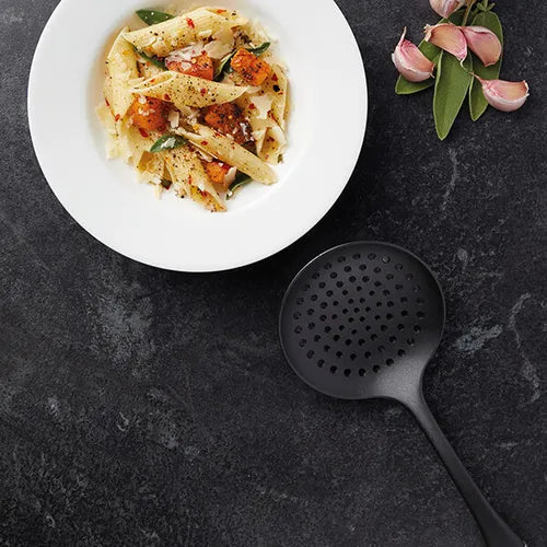 This skimmer spoon provides all the versatility, durability and comfort you'd expect from MasterClass, with the added benefit of hard-wearing nylon. It’s safe to use on any cooking surface, because MasterClass has used high-quality nylon that’s very robust, but gentle on non-stick pans. This premium skimming ladle also features MasterClass’s unique nylon handle. Smooth, broad and soft to touch, it assures comfortable use and slip-free results. Use it to master a wide range of kitchen tasks. Its perforated surface makes it easy to skim stews, soups and stocks as they simmer on your hob. Or you can use it to scoop up and drain vegetables to serve. Designed to last, this skimmer is covered by Masterclass' five-year guarantee.