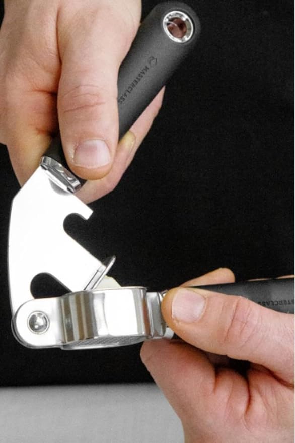 Crushing garlic doesn't have to be so hard on your hands. Save yourself the pain, and crush like an expert every time with this stainless steel garlic press from MasterClass. Intelligently designed, the garlic press is designed to extract the maximum amount of fragrant, crushed garlic, while ensuring your hands bear less of the strain. Its sleek, wide handles sit nicely in the palms of your hands, and are finished with a soft grip coating, so you can apply pressure, without sacrificing comfort. A light squeeze and your garlic clove is instantly transformed into a fresh, aromatic seasoning – perfect for adding to home-baked ciabatta bread, or creamy garlic and lemon chicken. Designed to last, this kitchen tool is covered by Masterclass' five-year guarantee.