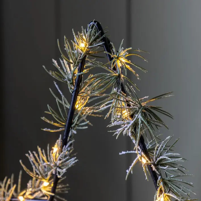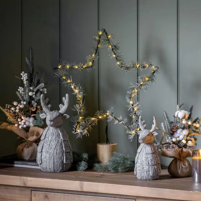 Traditional and rustic this light up star decoration will add some cosy Christmas charm to any home. With a string of LEDs and faux pine needles woven around a wirework star this charming decoration is a perfect festive addition
