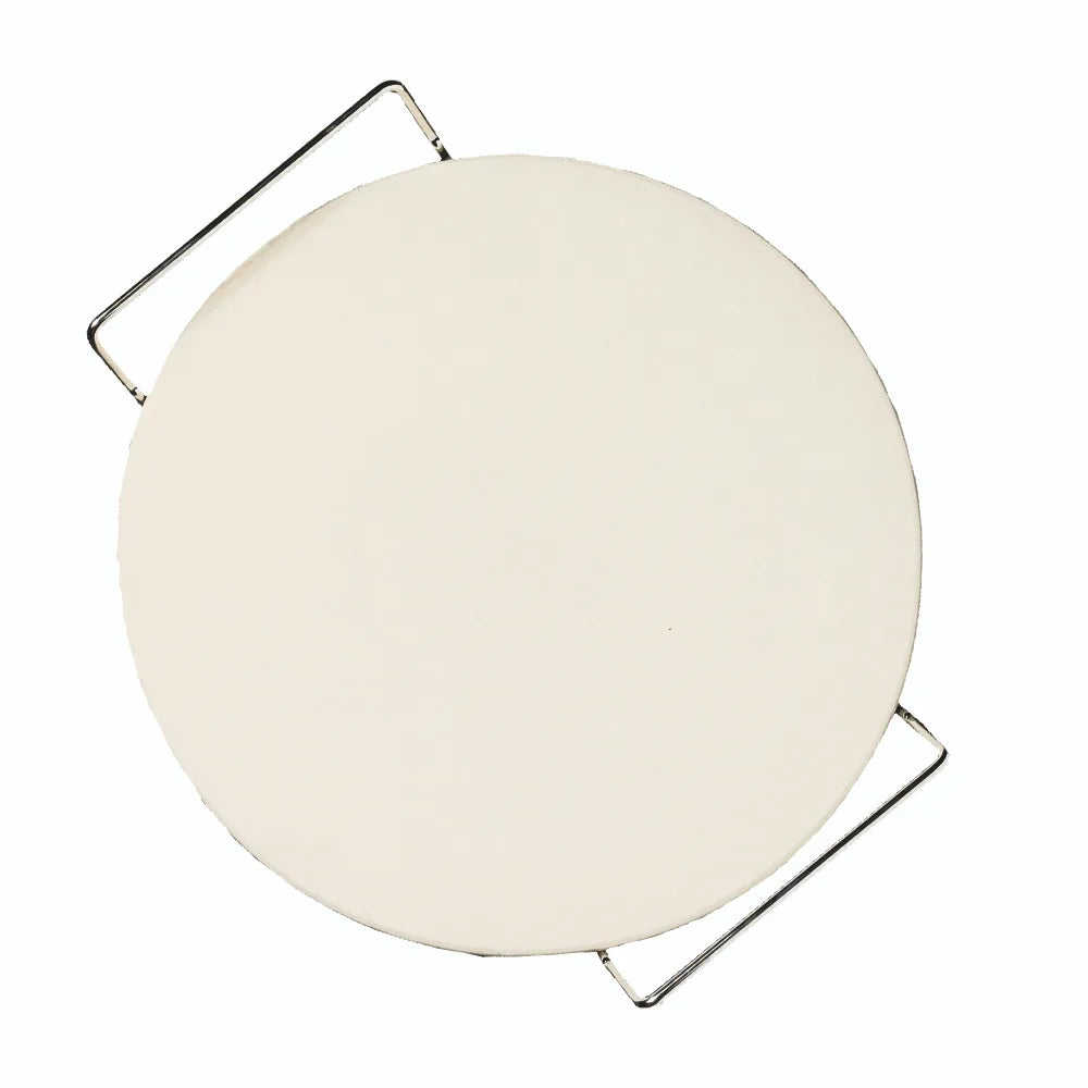 Traditional Pizza Stone Traditional ceramic pizza stone ensures the pizza is always cooked right through to the centre with a perfectly light and crisp crust. Complete with serving rack and pizza dough/sauce recipes. 38cm dia (15” dia). This product can withstand a temperature of 250°C.