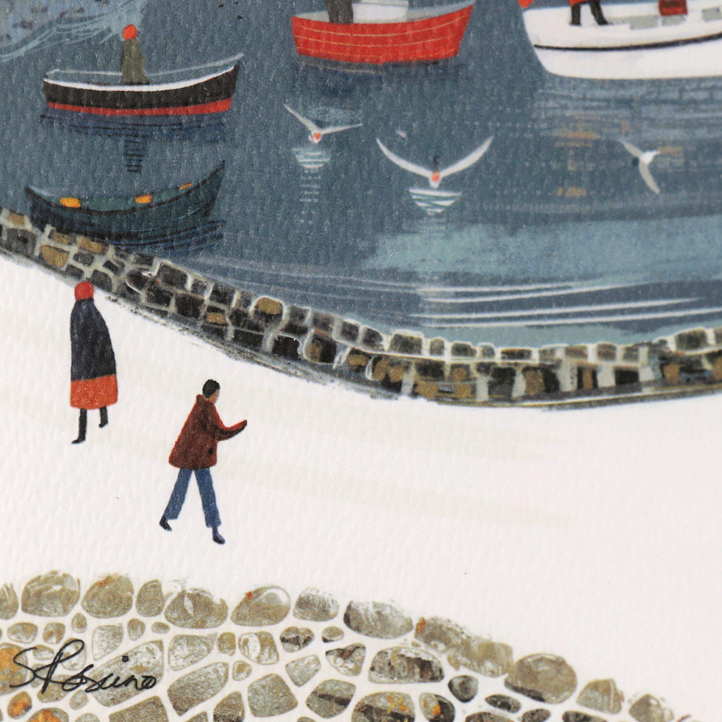 Step into a charming illustration that captures a picturesque Cornish Bay on a crisp autumnal day. The scene is full of life, encouraging folk to embrace the great outdoors. Small sailboats fill the bay while the coastal walkways bustle with strollers.