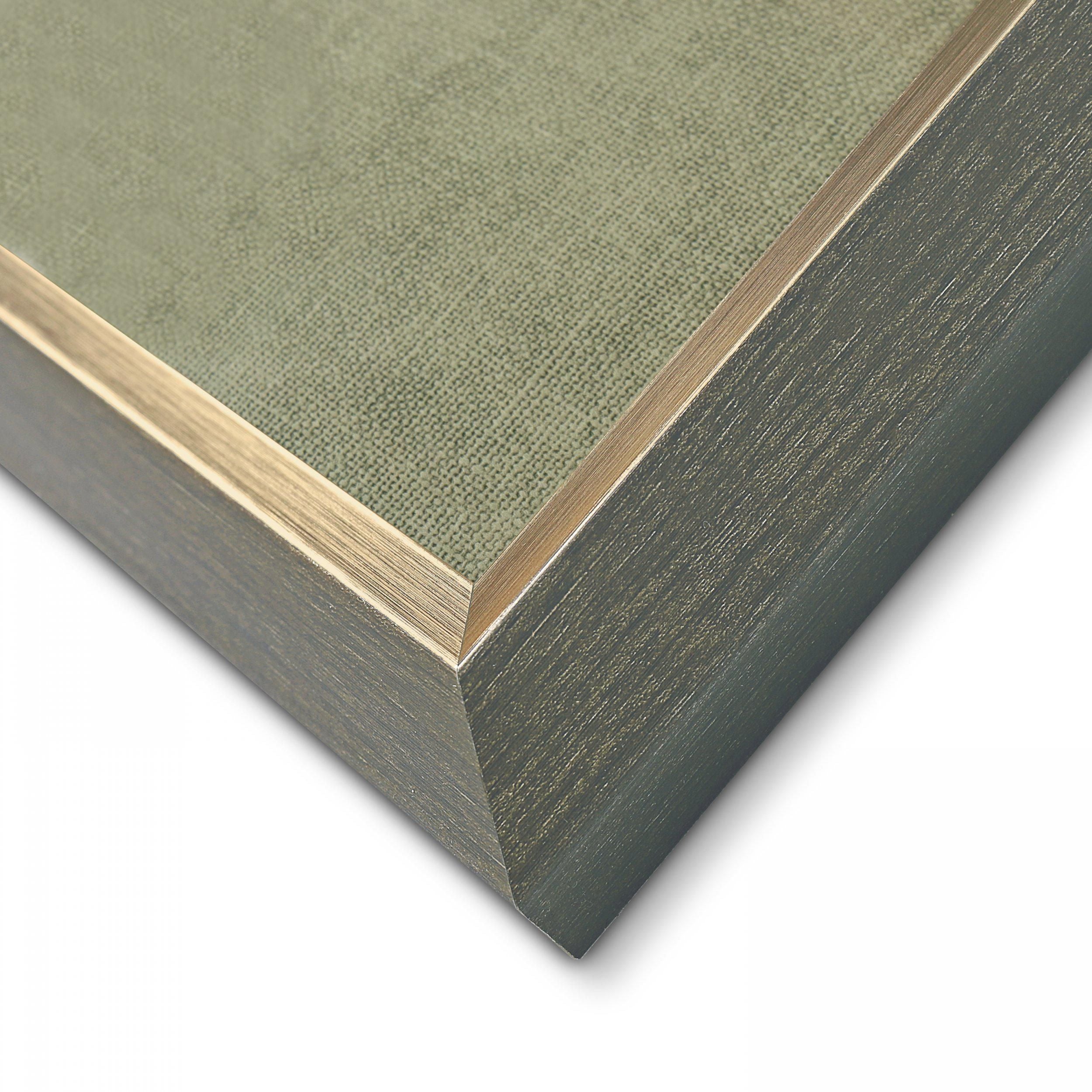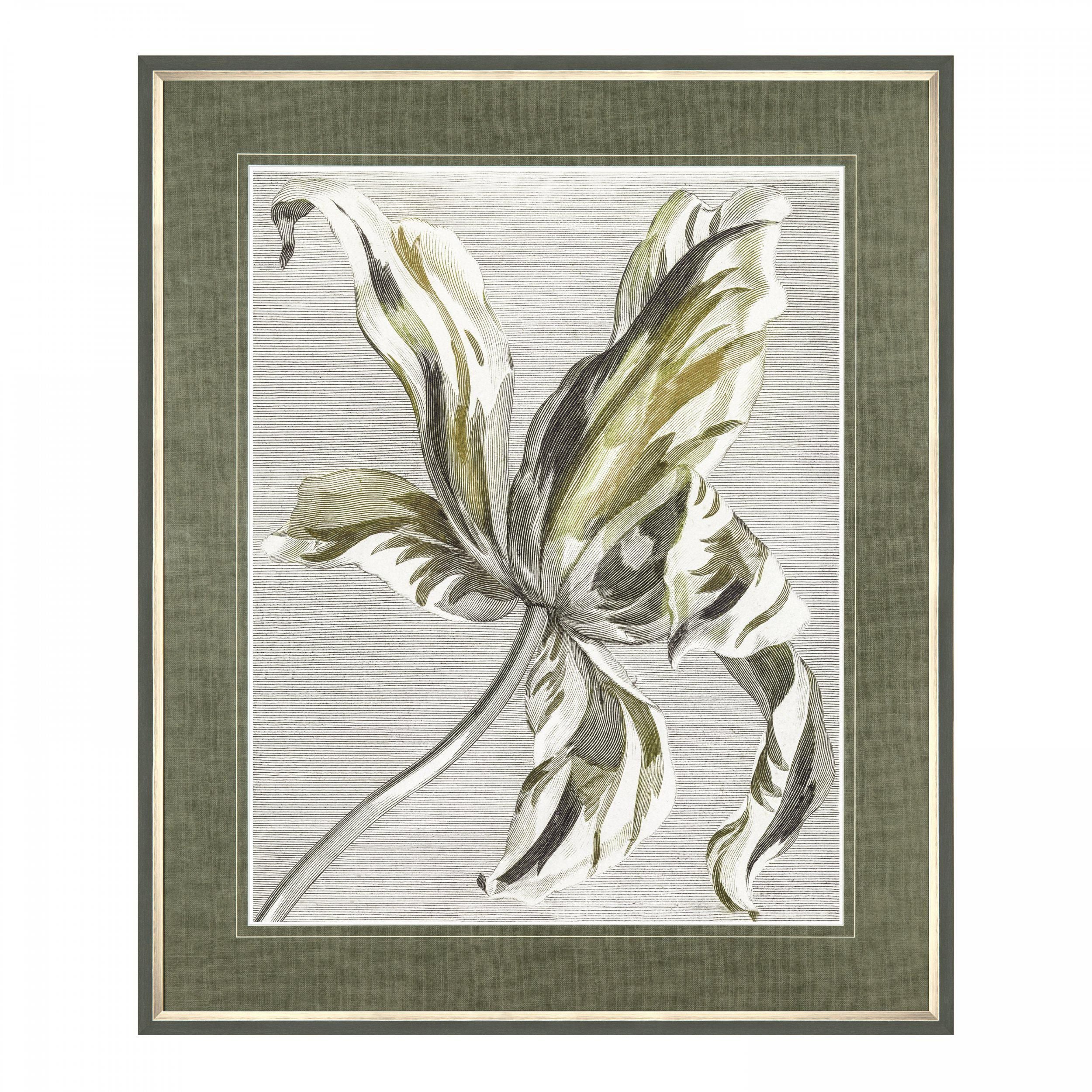A pure appreciation of a tulip flower. Johan Teyler, a multitalented Dutch artist, carefully illustrates the dainty intricacies of its petal design. Through a green colour palette, the shading reveals a wild composition through paint and pencil. A decorative olive green coloured mount emphasises the glazed print. Using a gentle colour palette, a slimline brown frame with a gold lip heightens the wall art.